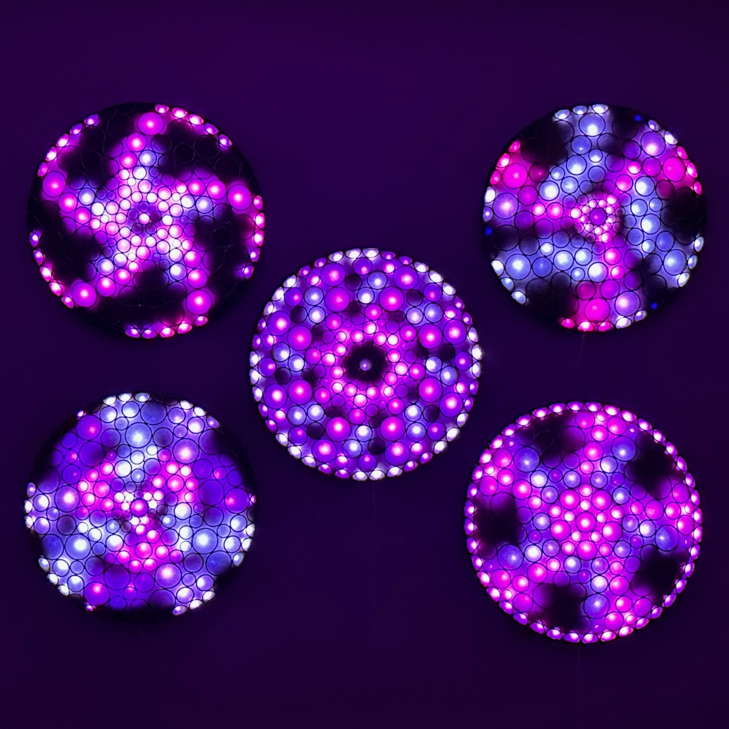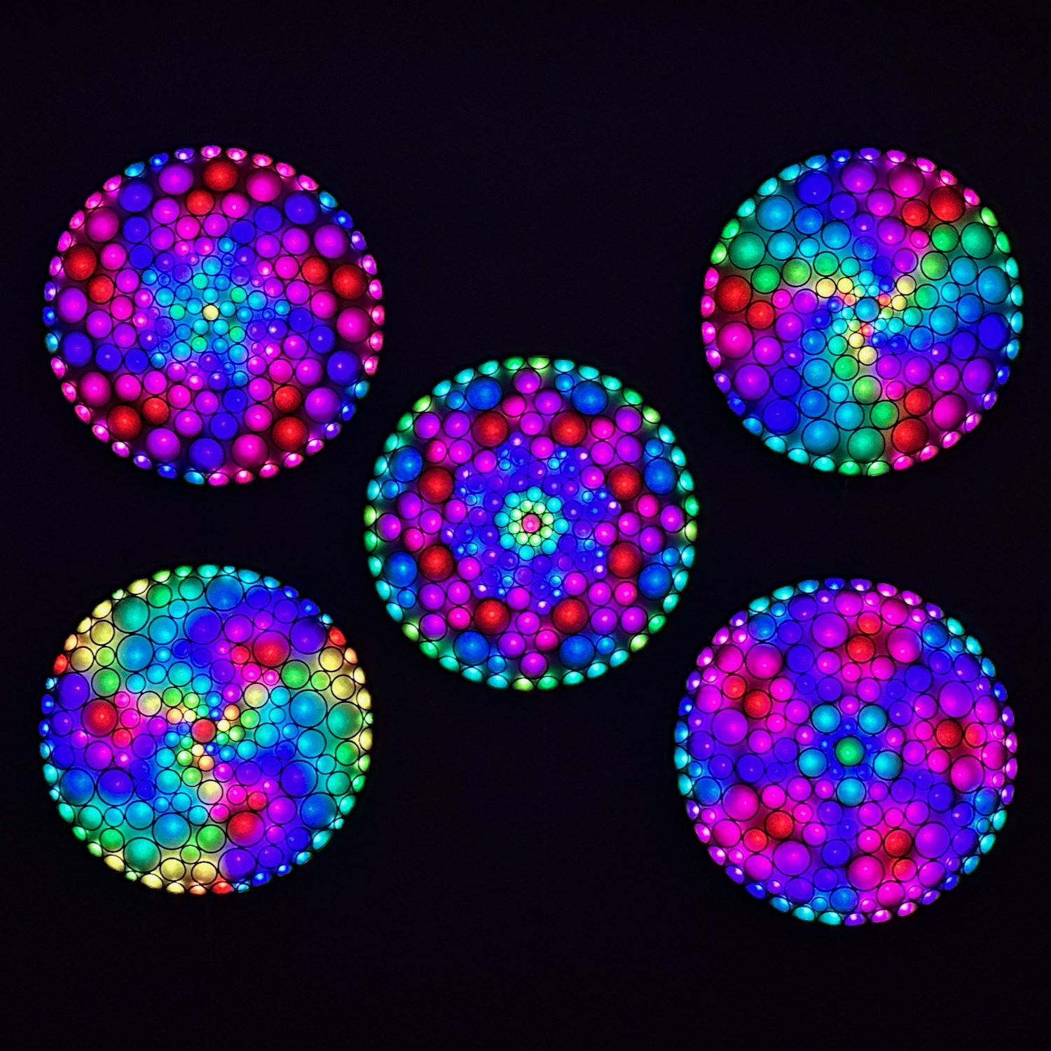 The Illuminated Rings series explores different geometric arrangements of metal rings with embedded animated RGB LED backlighting. These pieces can be enjoyed as individual units, and many can also be displayed as synchronized groups that display a timed sequence of matching effects. The color changes are similar, but the underlying pixel mapping in each piece varies with the type of geometric symmetry within the design. Viewing several pieces simultaneously can help to amplify these differences.