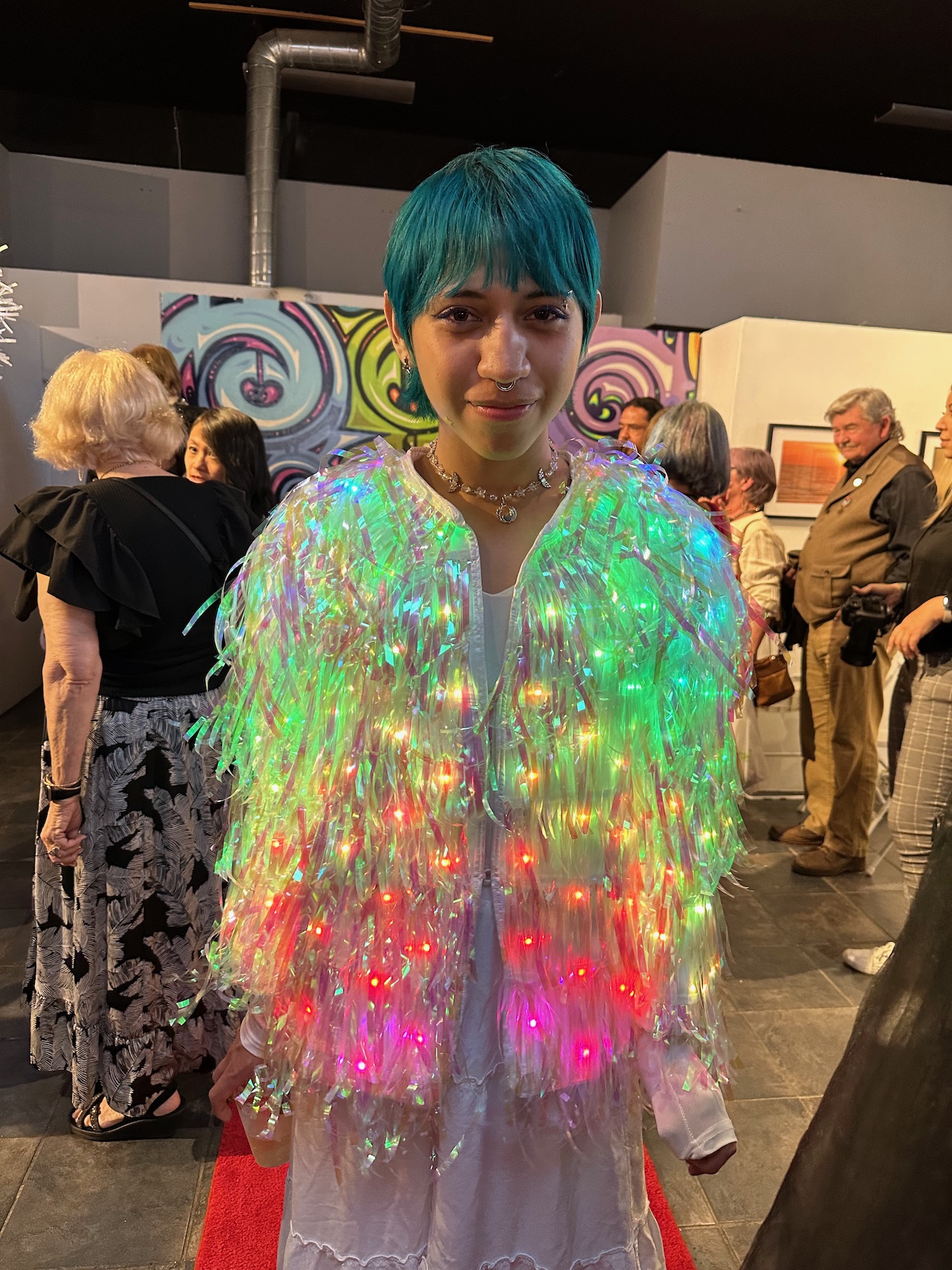 The Recycled Materials Runway Event was held at the end of the show, as an annual fundraiser for the Escondido Arts Partnership (EAP). This show featured a variety of garments that were constructed and embellished using conventional and non-convential elements including thrifted reconditioned and trashed materials. My submission to this portion of the show was an LED fringe jacket made with discarded fringe party curtains.