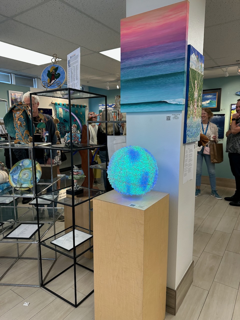 My new piece Infernal Orb was accepted for the juried show. It uses color changes in the lighting effects to illustrate a transition from a healthy blue-green planet to an unlivable and overheated red-orange sphere.
