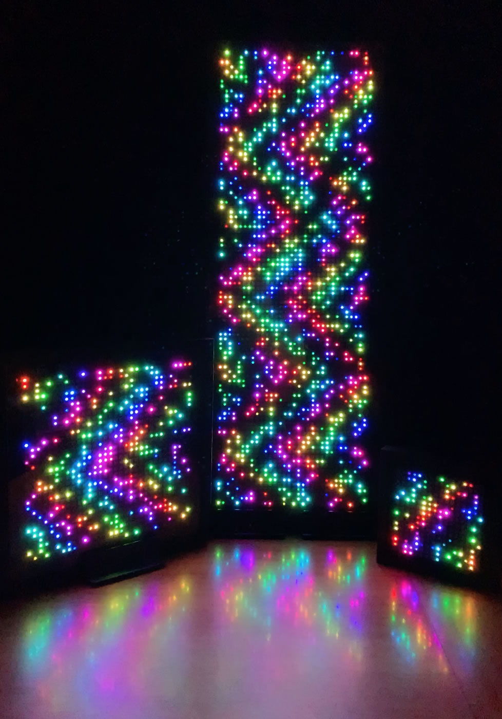These framed illuminated panels display multi-color geometric patterns that can be customized to match your mood, whether you want a high-energy dance party, or a chill space where you're just relaxing and sitting (and possibly staring). They contain dense grids of individually adressable RGB LED pixels, and are controlled by the same LED drivers that I've developed over the years for my custom lighted clothing, but without the pesky requirements of being flexible, washable, or fitting a specific person.