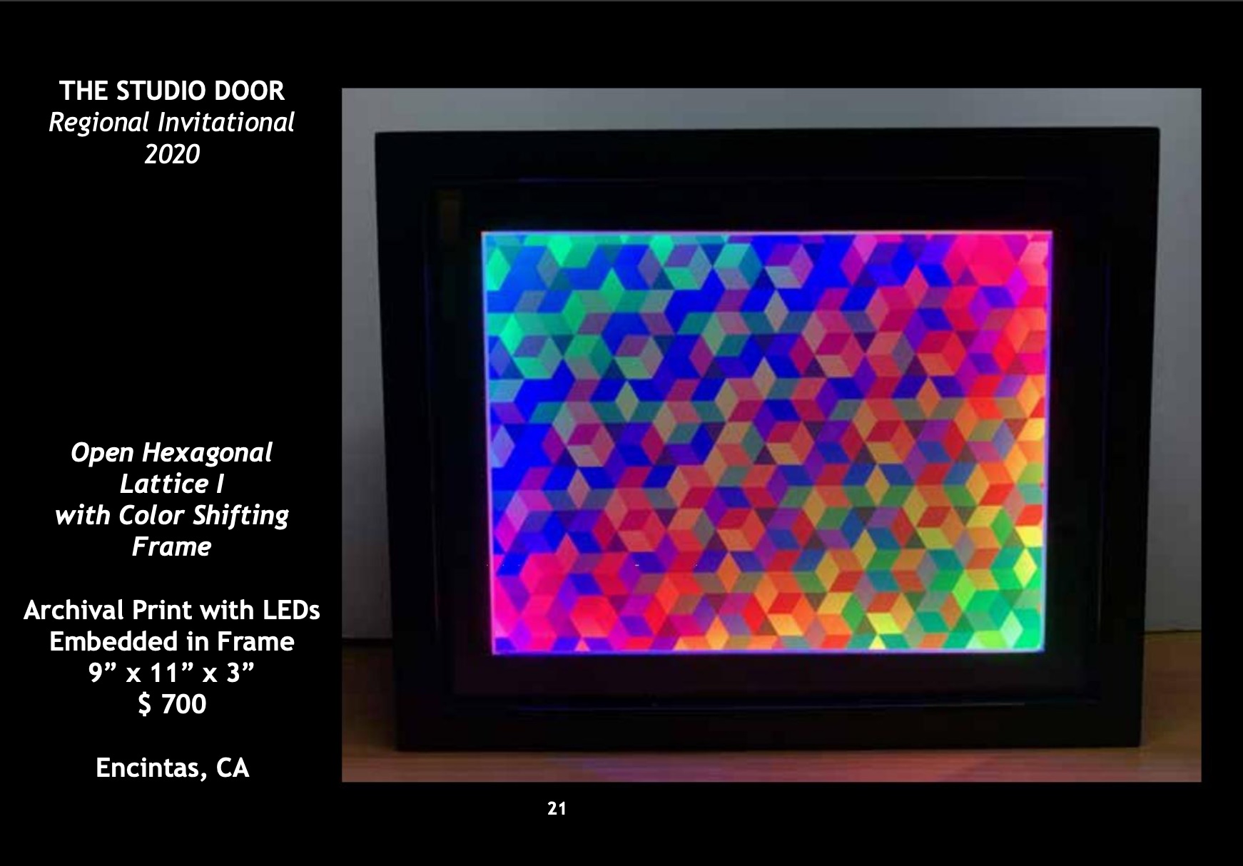Two of my pieces are being shown in this exhibit: Open Hexagonal Lattice I with Color Shifting Frame, and Closed Quadrilateral Lattice with Color Shifting Frame. Both are part of my color shifting frame series.