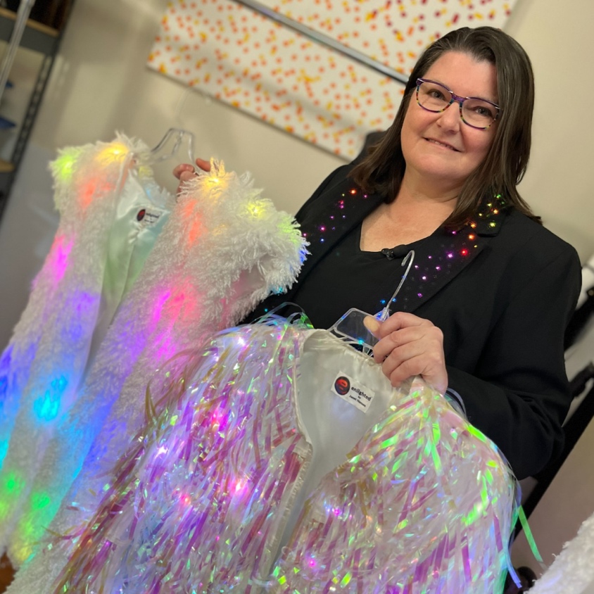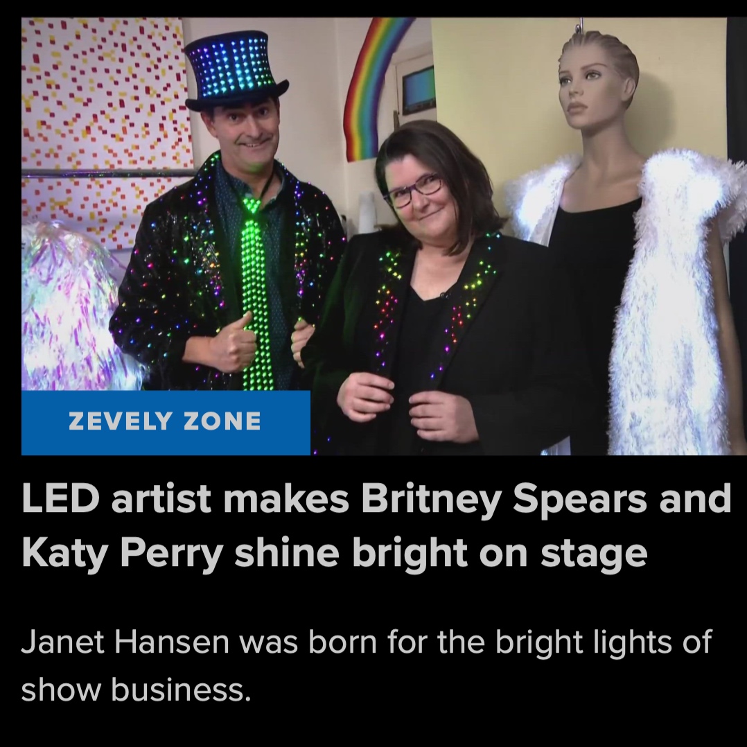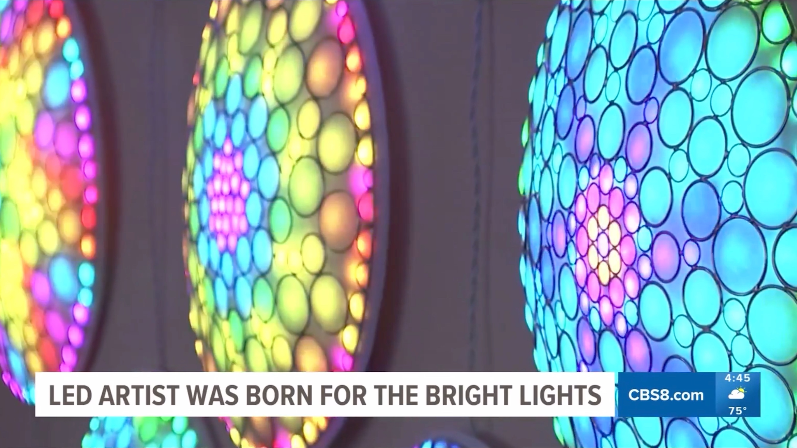 Jeff Zevely of CBS8 San Diego made a visit to my home studio to learn about my lighted clothing business and unusual career path. He got to try on several samples of my work, and we did a sit-down interview in the living room, surrounded by some of my other LED art.