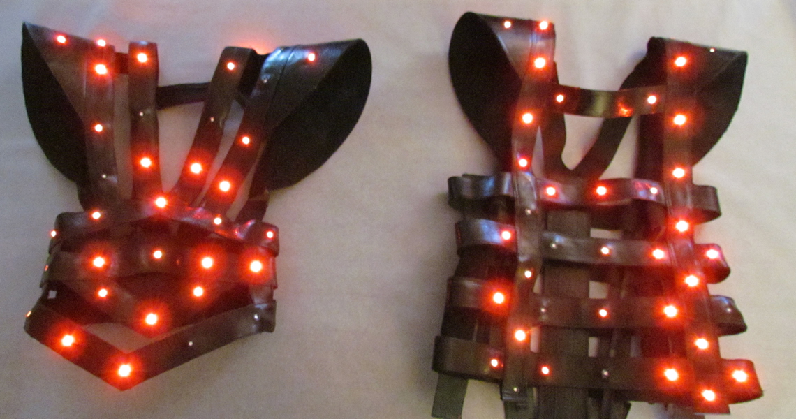 For the dancers' costumes, lights were mounted on leather harnesses (non washable) worn over other pieces that could be washed daily. The control electronics and batteries were concealed in pockets behind the straps and beneath the shoulder pads, depending on the costume.
