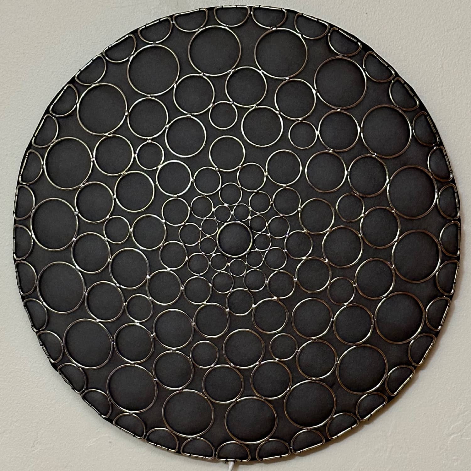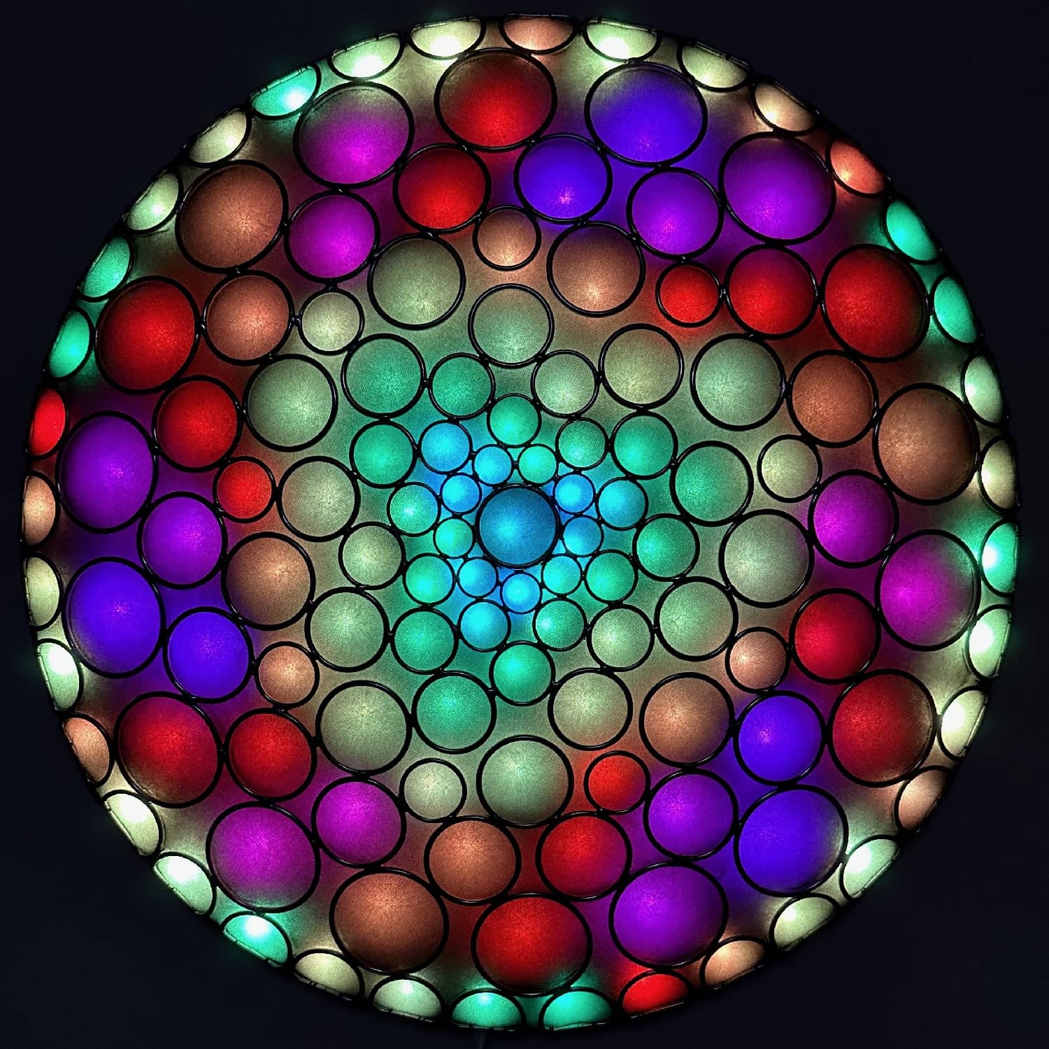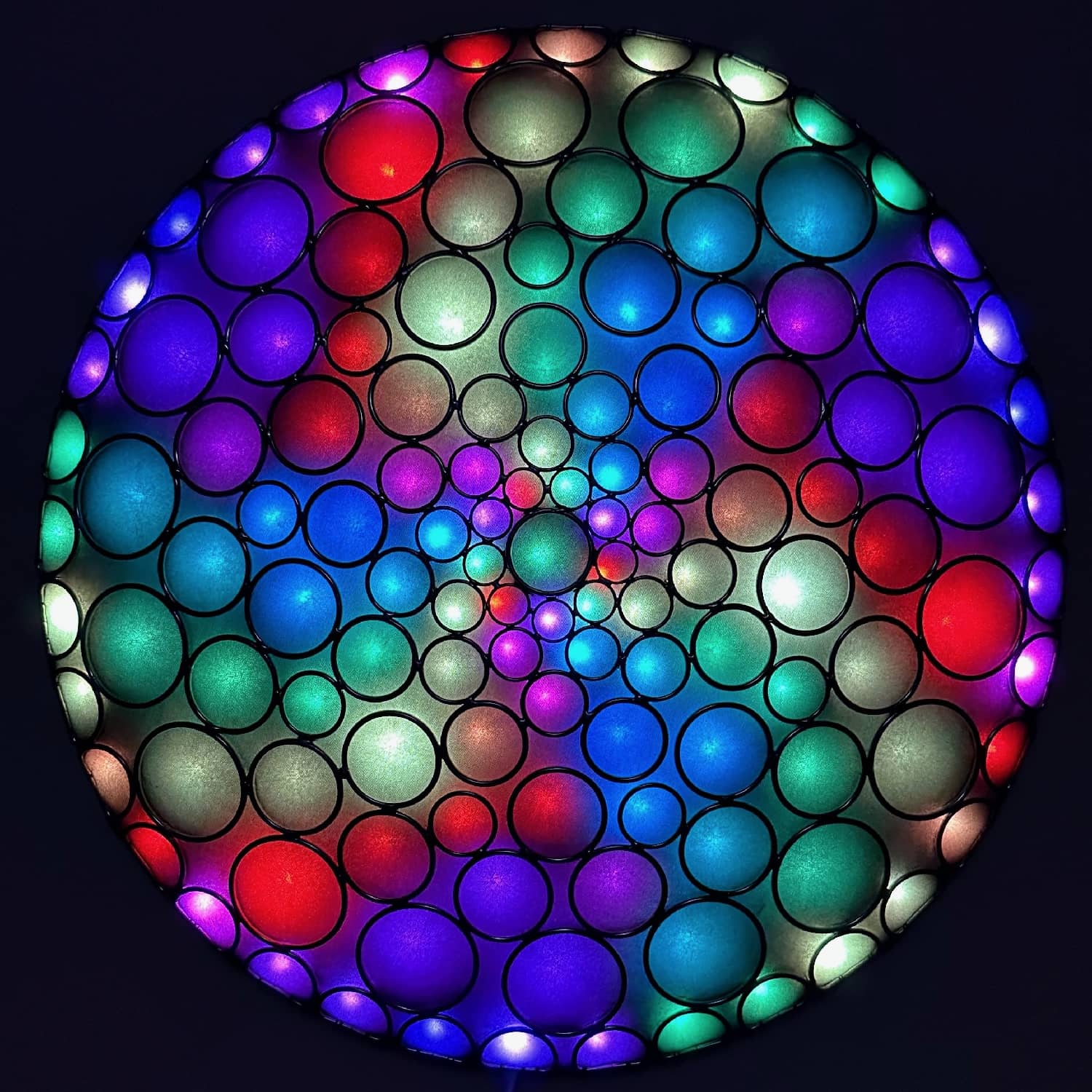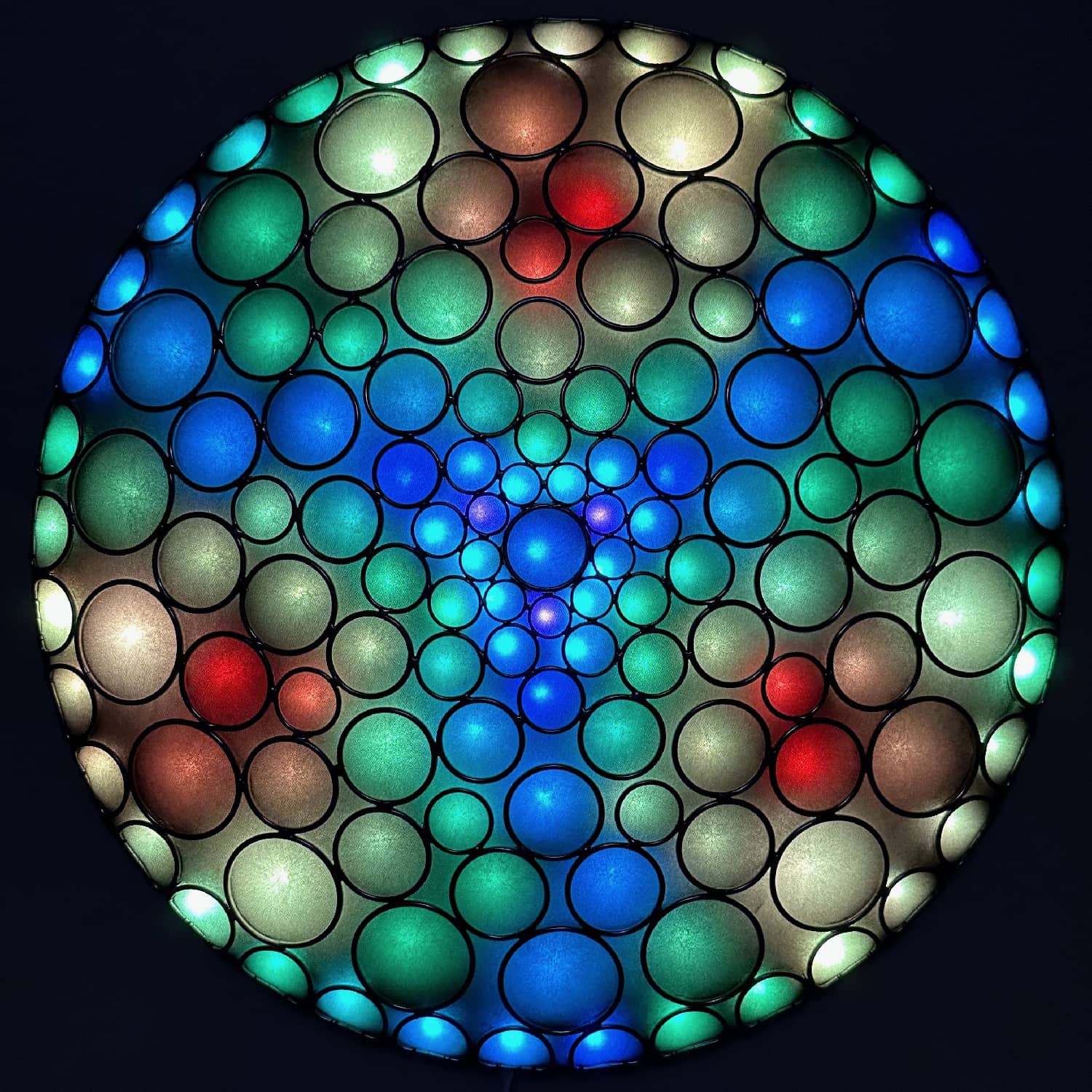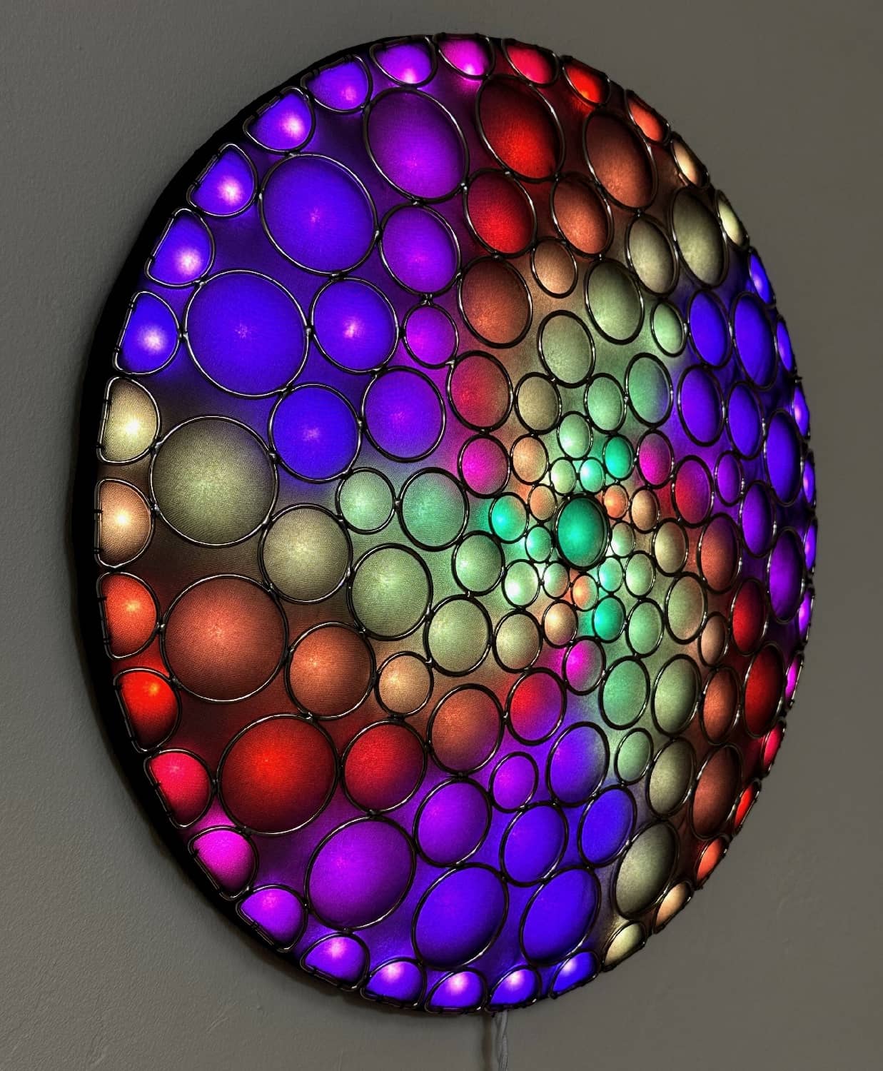 This is part of the Enlighted Rings series of wall-mounted mixed-media art with embedded RGB LEDs. The outermost layer is made with several sizes of silver-colored metal circles and D-rings that have been soldered into a shallow convex dome shape. A fabric diffusing layer is mounted behind the rings, and RGB LED pixels are mounted on an additional internal layer, with one LED aligned with the center of each ring. Some diffused light is also visible through the negative space between rings.