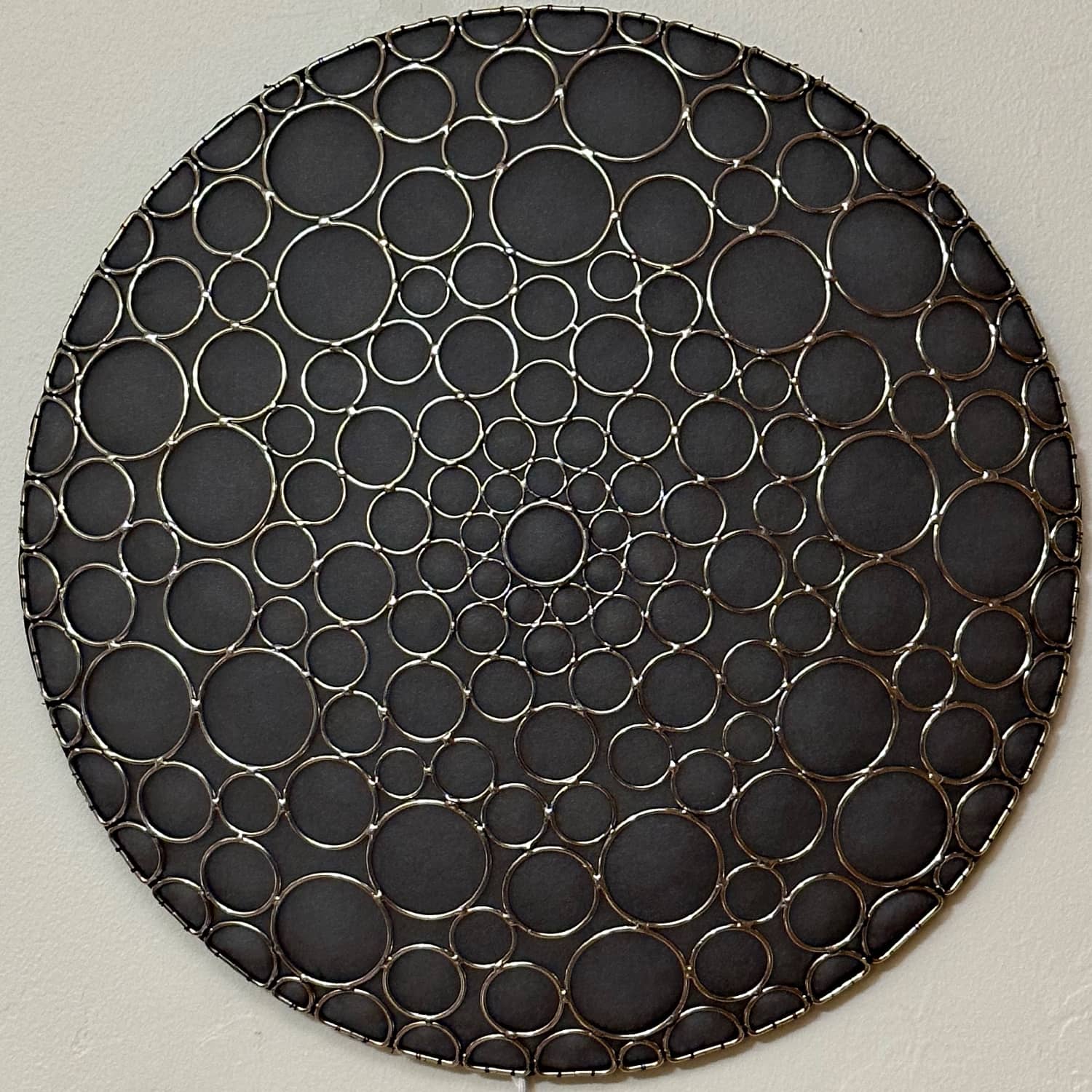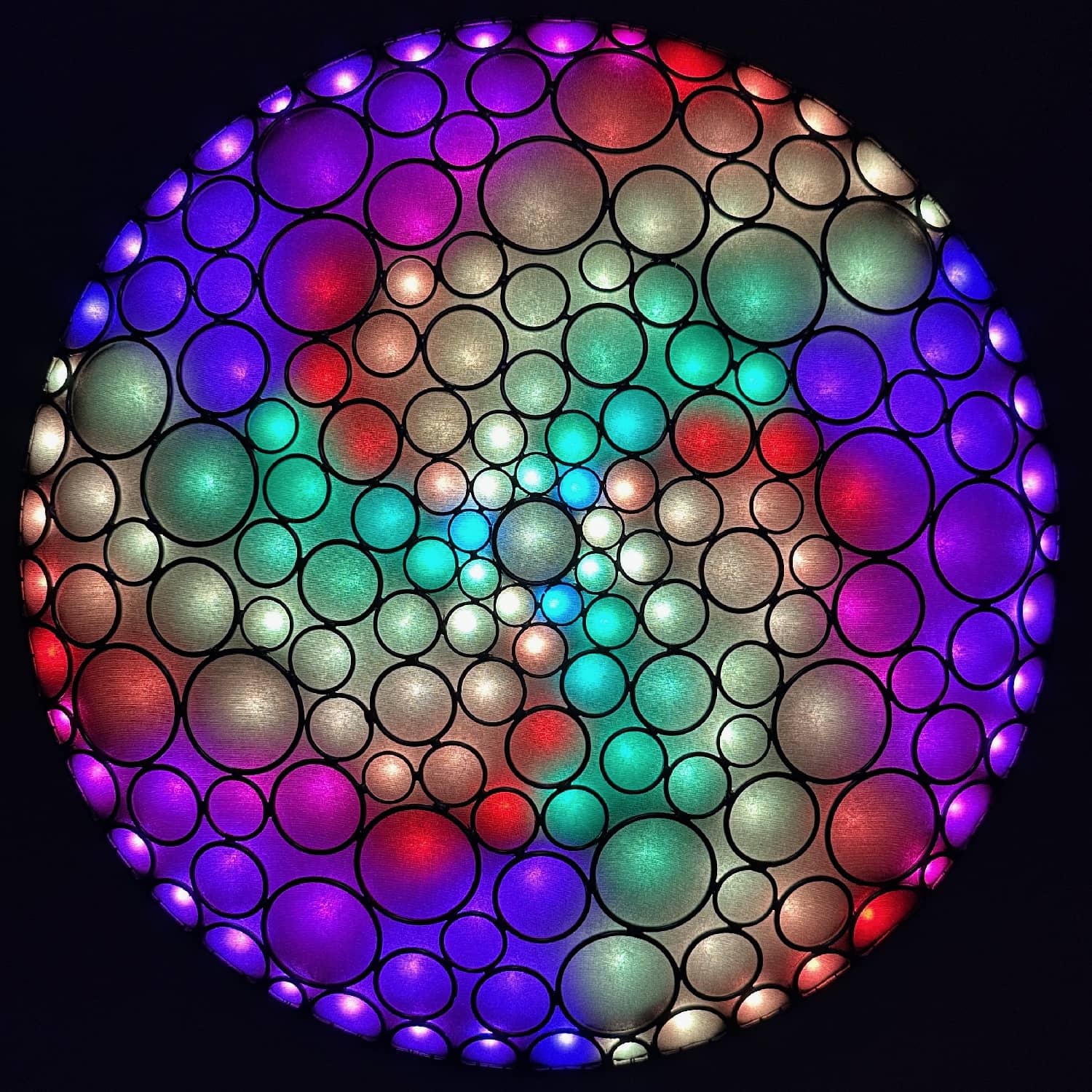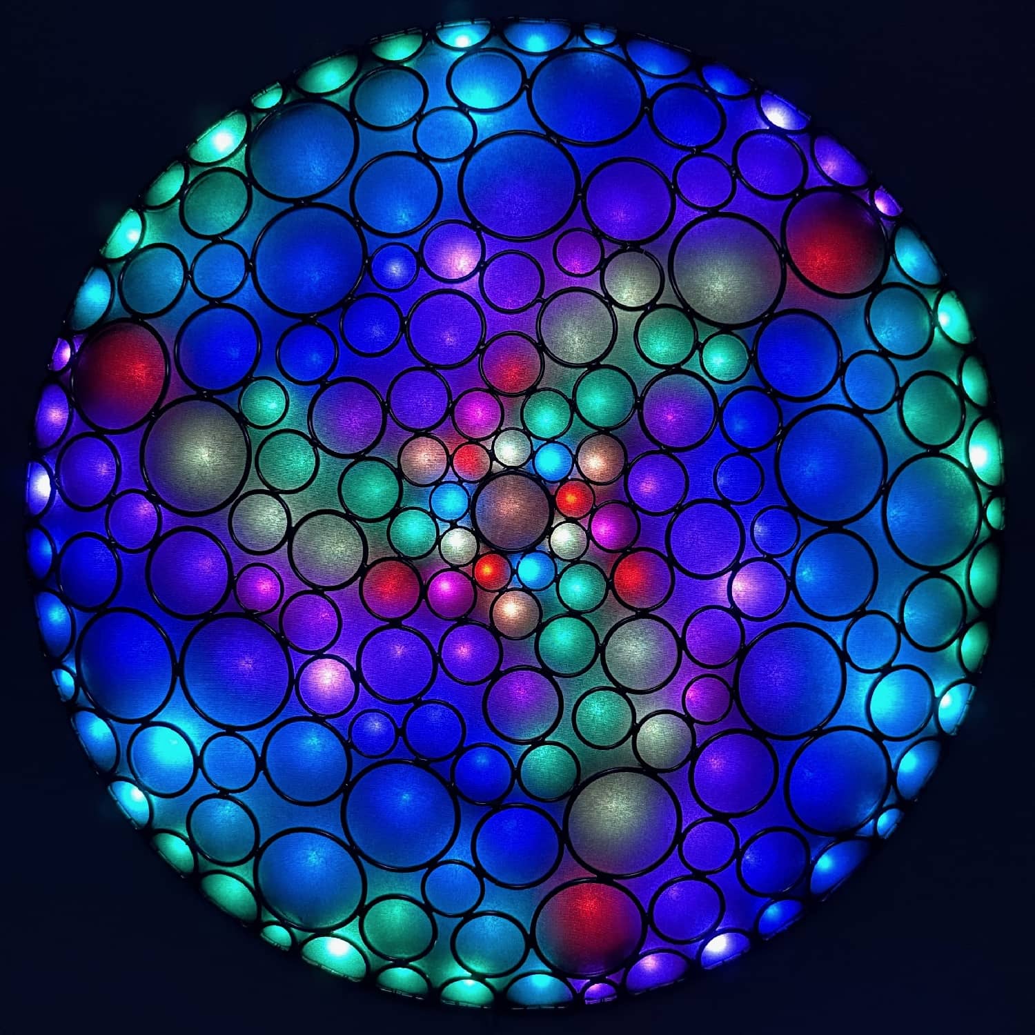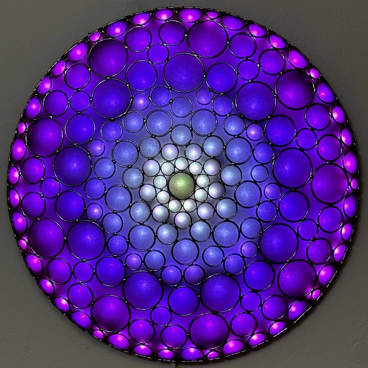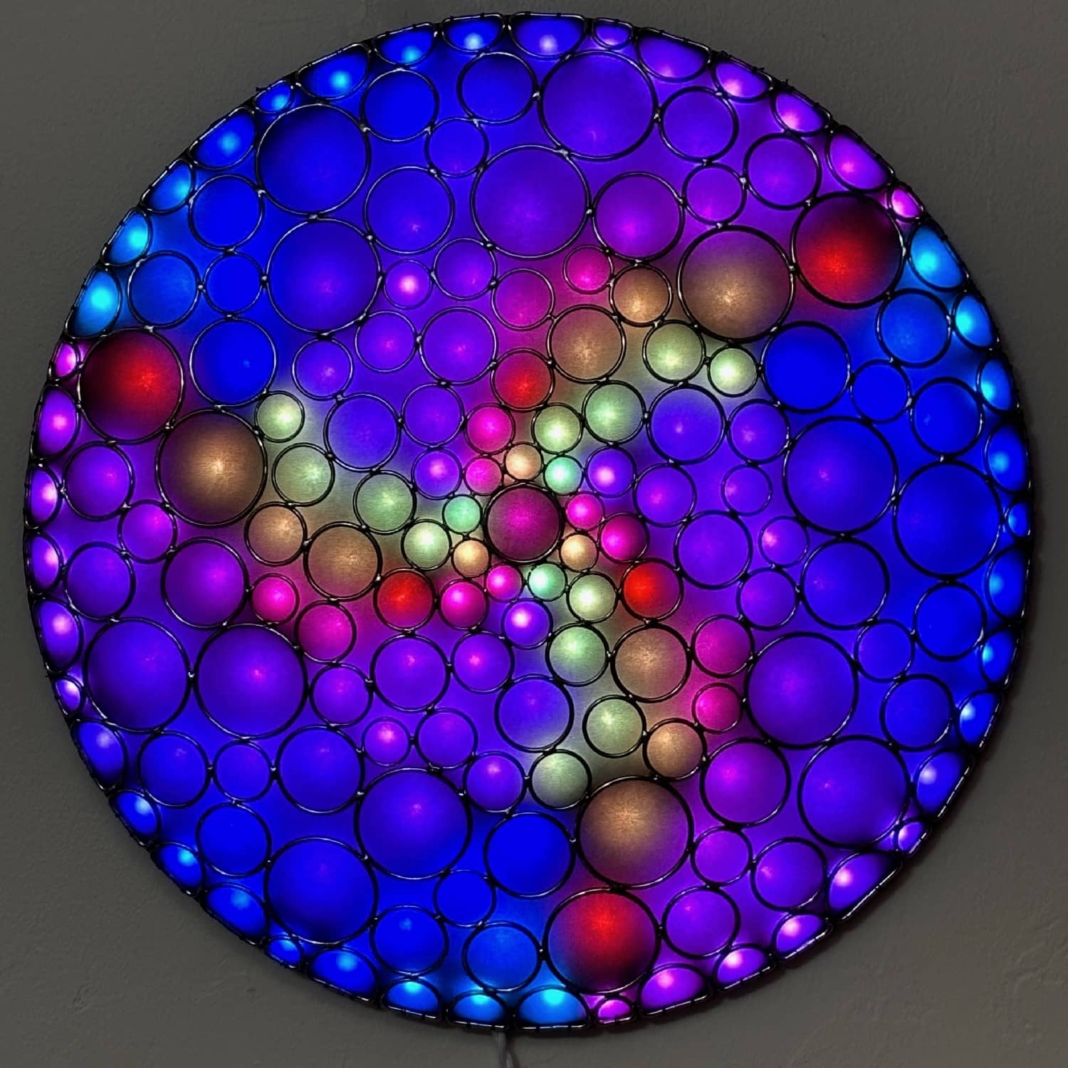 This is part of the Enlighted Rings series of wall-mounted mixed-media art with embedded RGB LEDs. The outermost layer is made with several sizes of silver-colored metal circles and D-rings that have been soldered into a shallow convex dome shape. A fabric diffusing layer is mounted behind the rings, and RGB LED pixels are mounted on an additional internal layer, with one LED aligned with the center of each ring. Some diffused light is also visible through the negative space between rings.