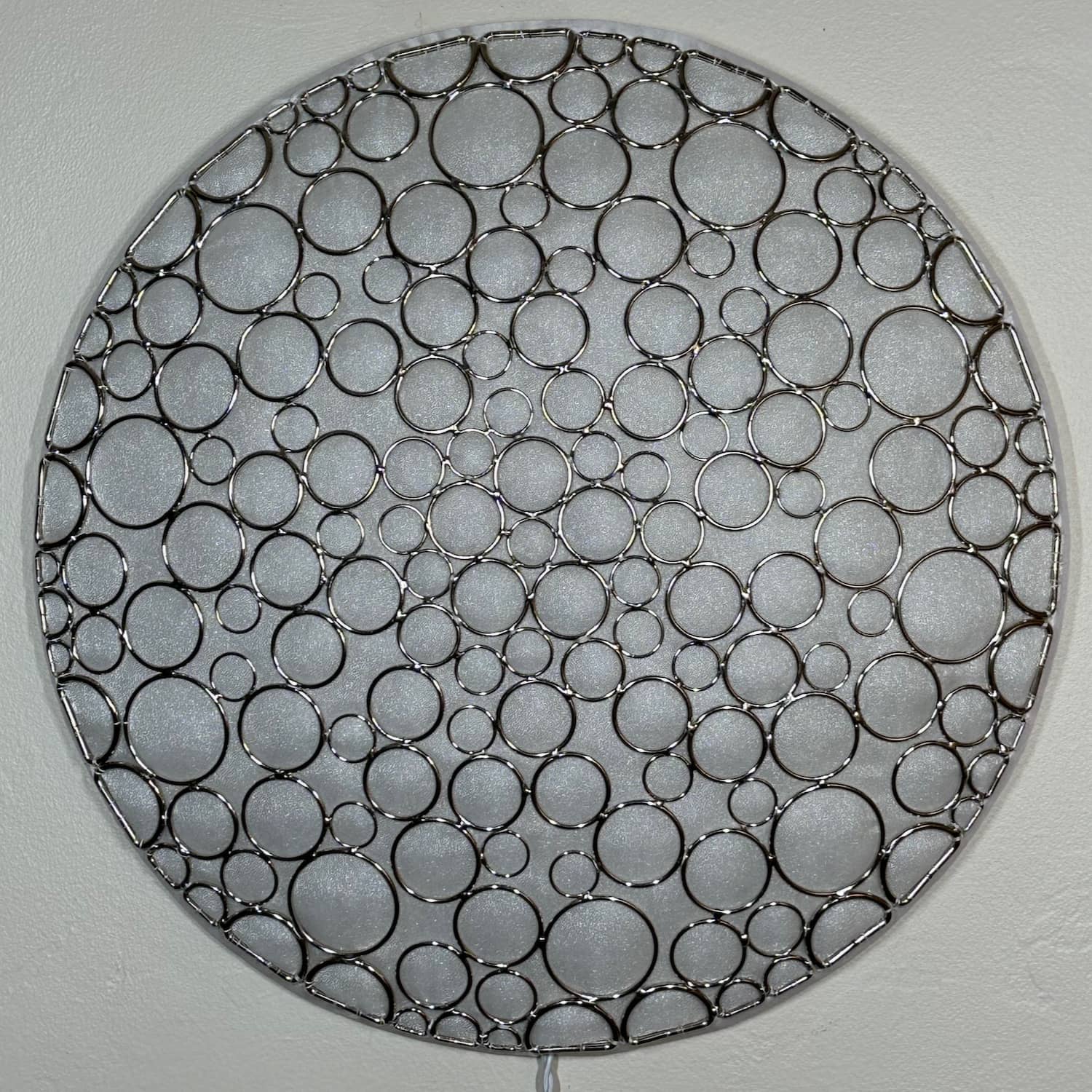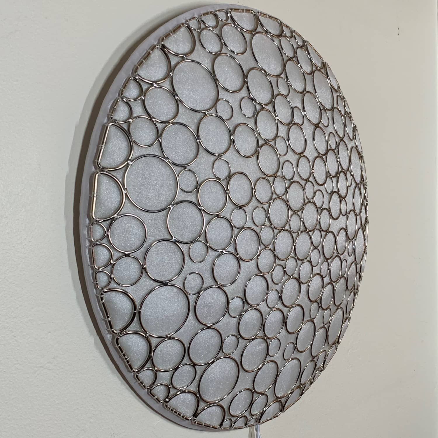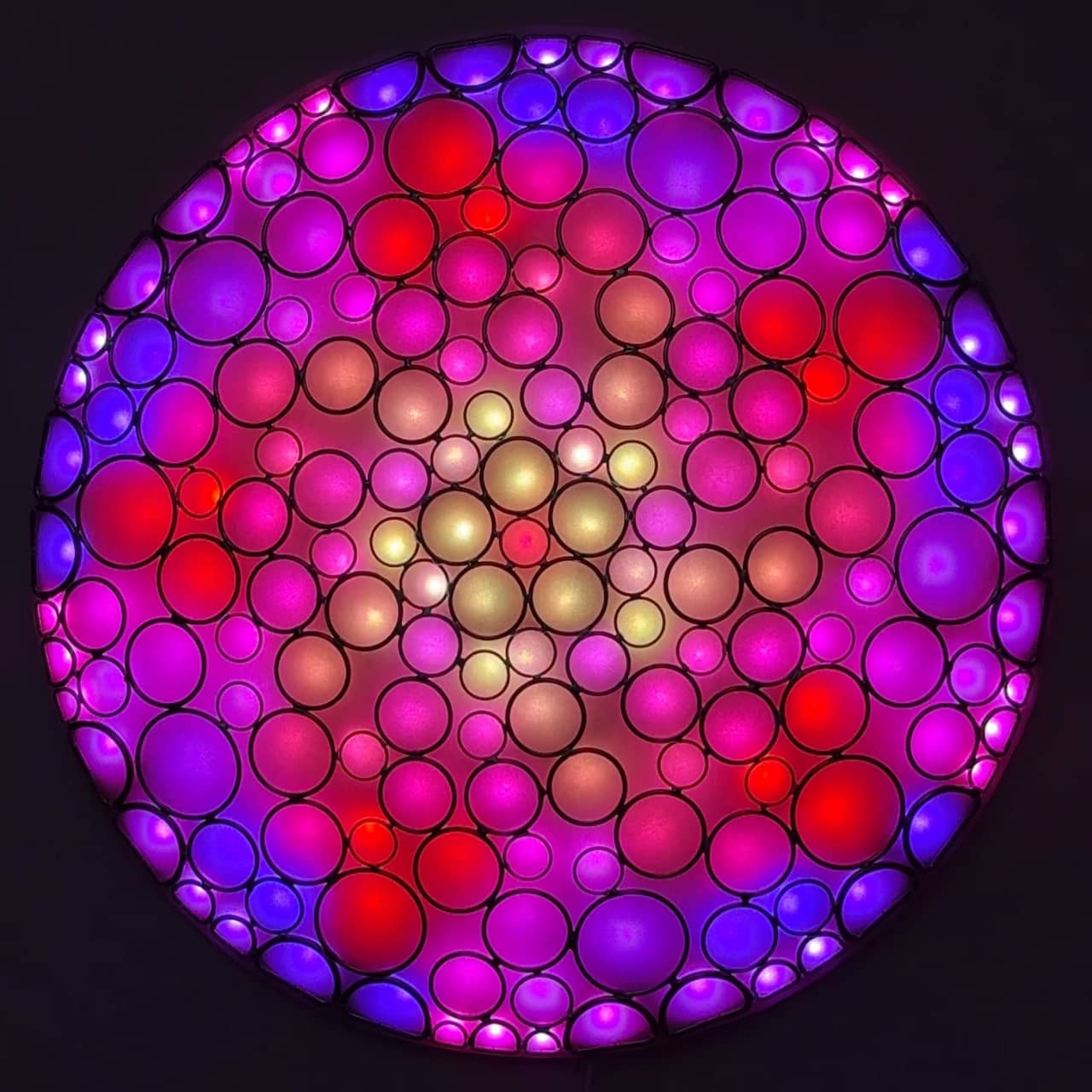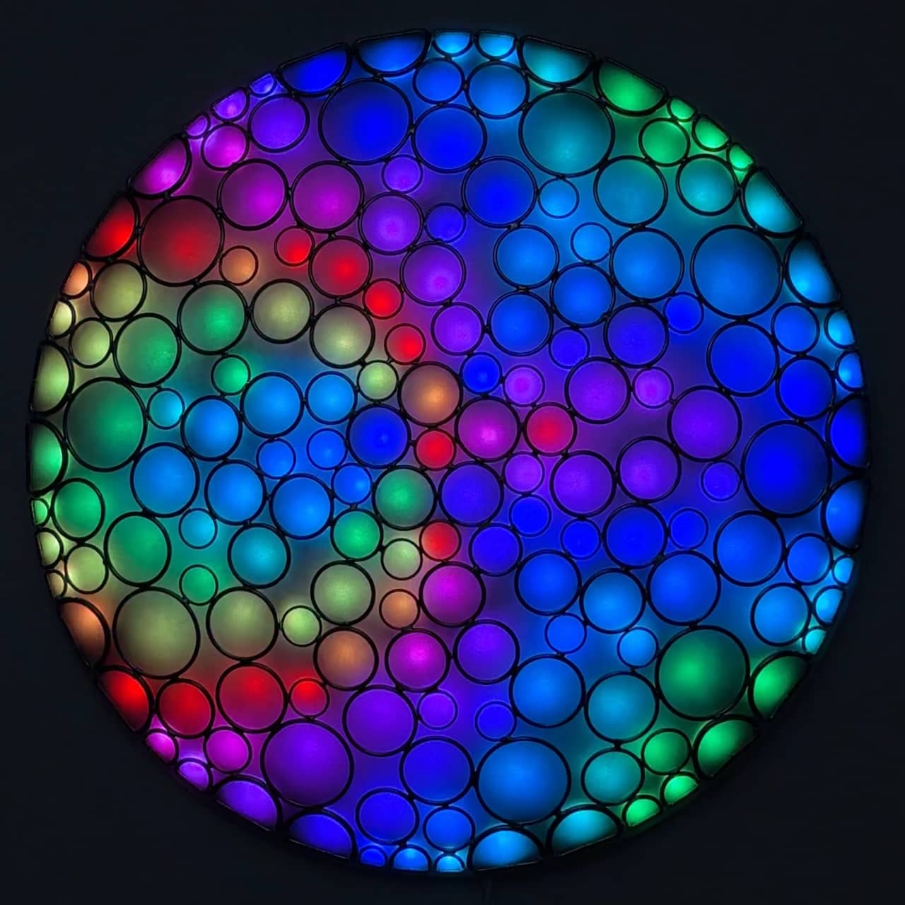 This is part of the Enlighted Rings series of wall-mounted mixed-media art with embedded RGB LEDs. The outermost layer is made with several sizes of silver-colored metal circles and D-rings that have been soldered into a shallow convex dome shape. A fabric diffusing layer is mounted behind the rings, and RGB LED pixels are mounted on an additional internal layer, with one LED aligned with the center of each ring. Some diffused light is also visible through the negative space between rings.