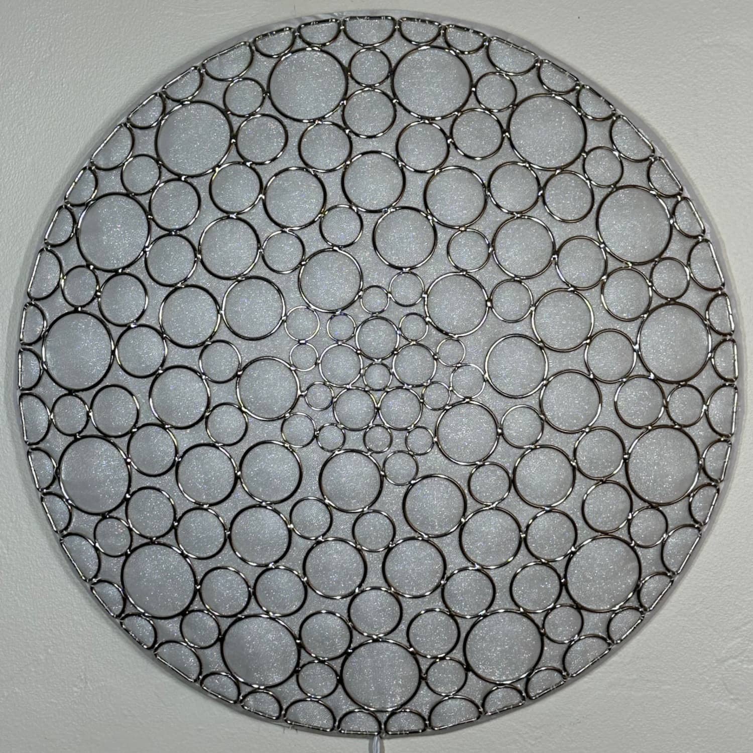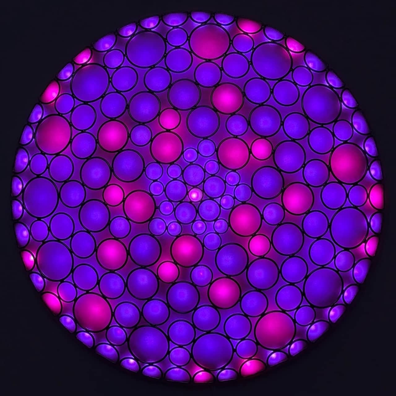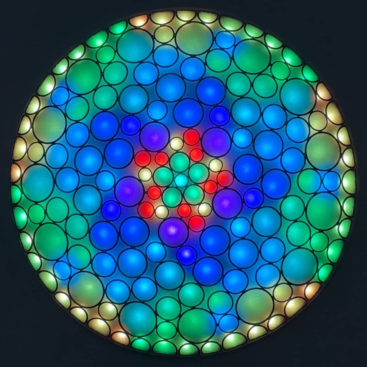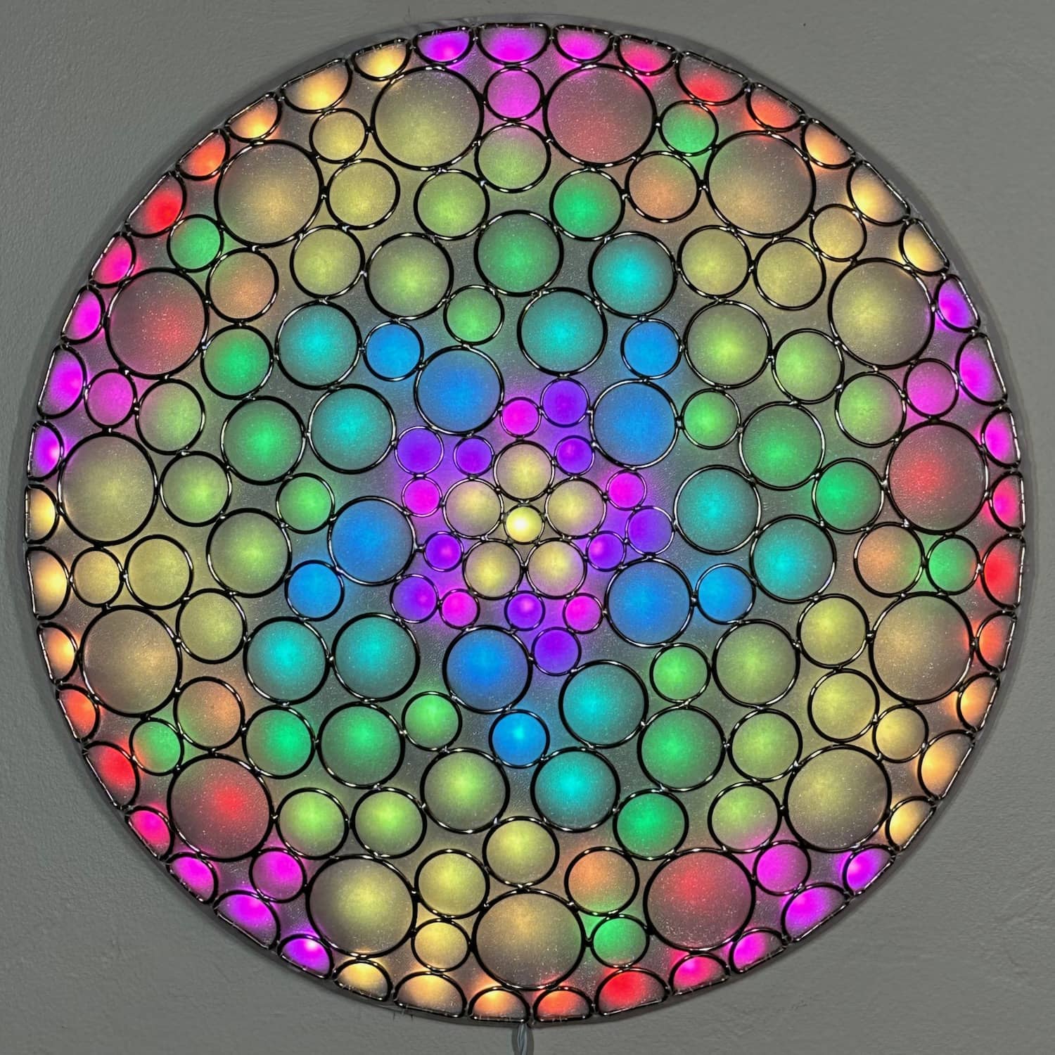 This is part of the Enlighted Rings series of wall-mounted mixed-media art with embedded RGB LEDs. The outermost layer is made with several sizes of silver-colored metal circles and D-rings that have been soldered into a shallow convex dome shape. A fabric diffusing layer is mounted behind the rings, and RGB LED pixels are mounted on an additional internal layer, with one LED aligned with the center of each ring. Some diffused light is also visible through the negative space between rings.