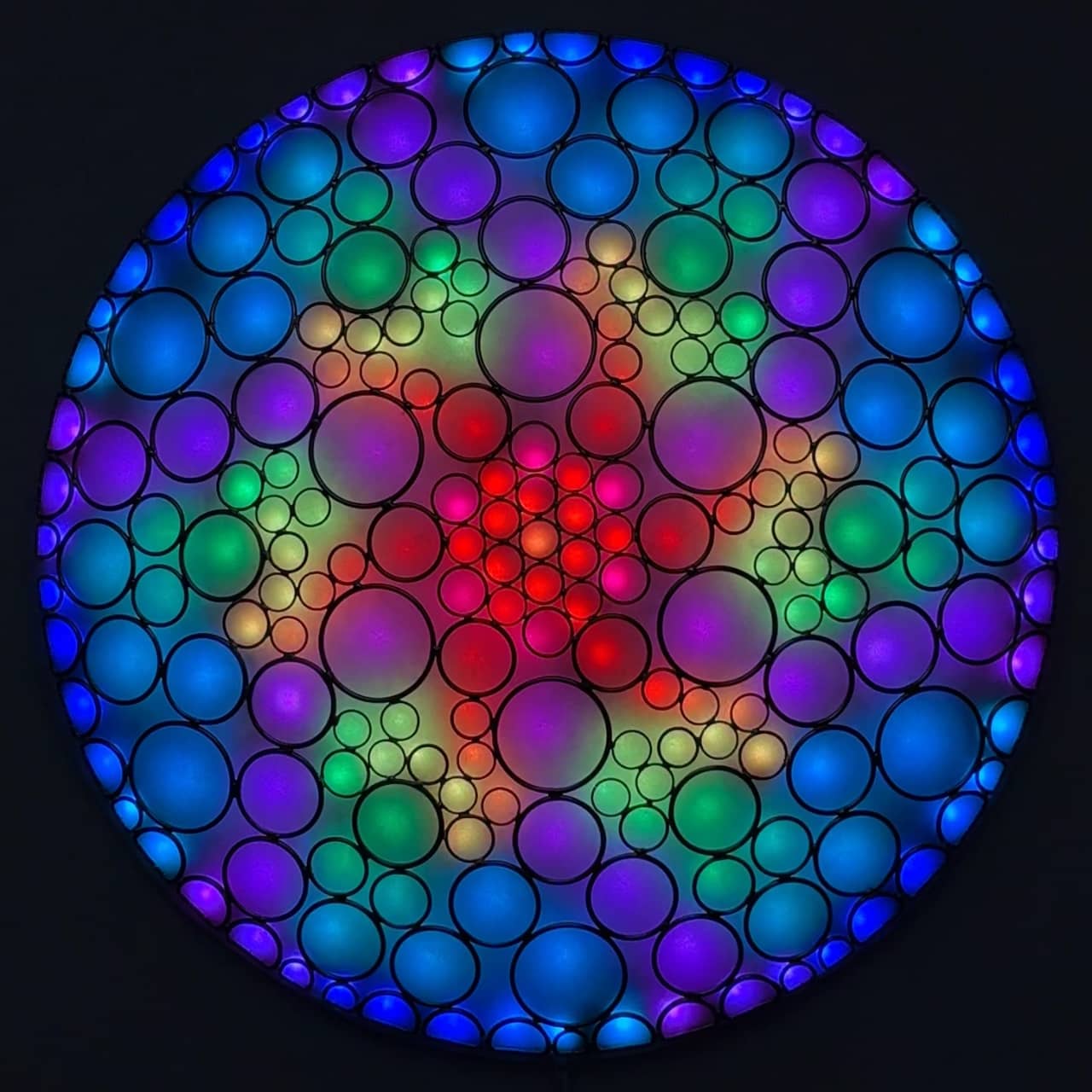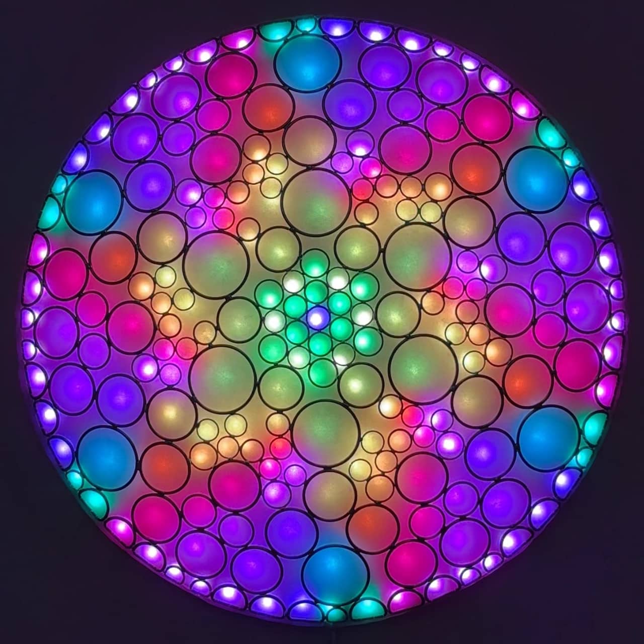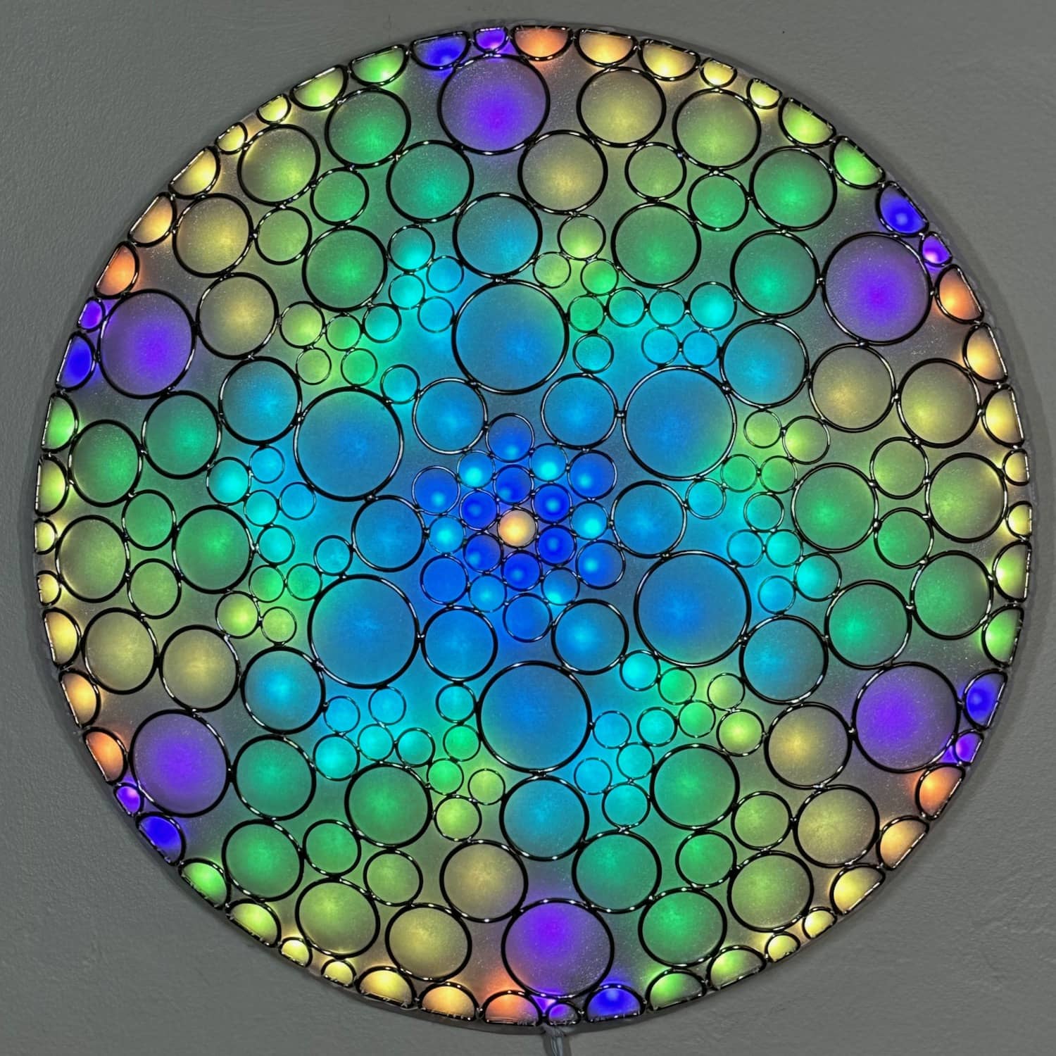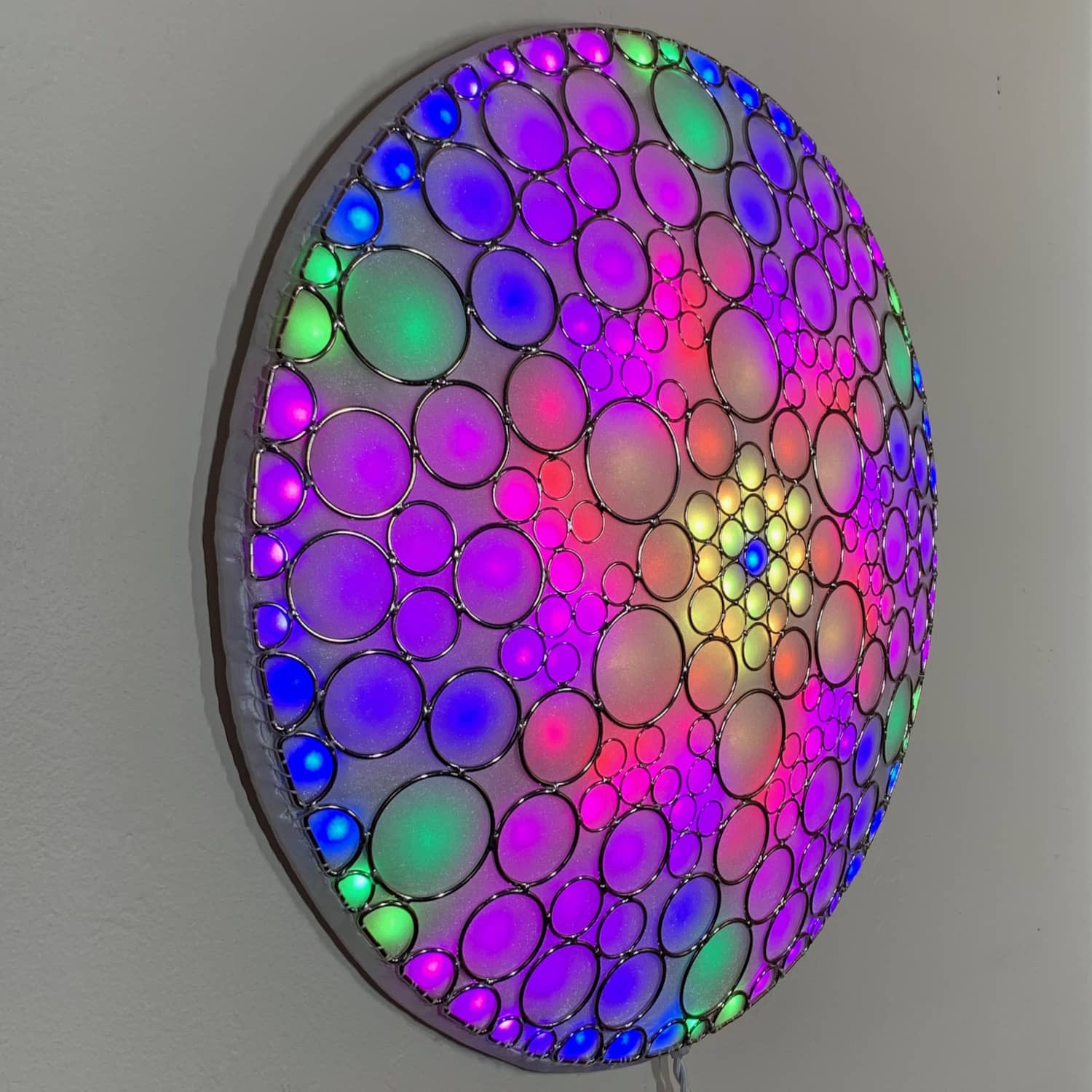 This is part of the Enlighted Rings series of wall-mounted mixed-media art with embedded RGB LEDs. The outermost layer is made with several sizes of silver-colored metal circles and D-rings that have been soldered into a shallow convex dome shape. A fabric diffusing layer is mounted behind the rings, and RGB LED pixels are mounted on an additional internal layer, with one LED aligned with the center of each ring. Some diffused light is also visible through the negative space between rings.