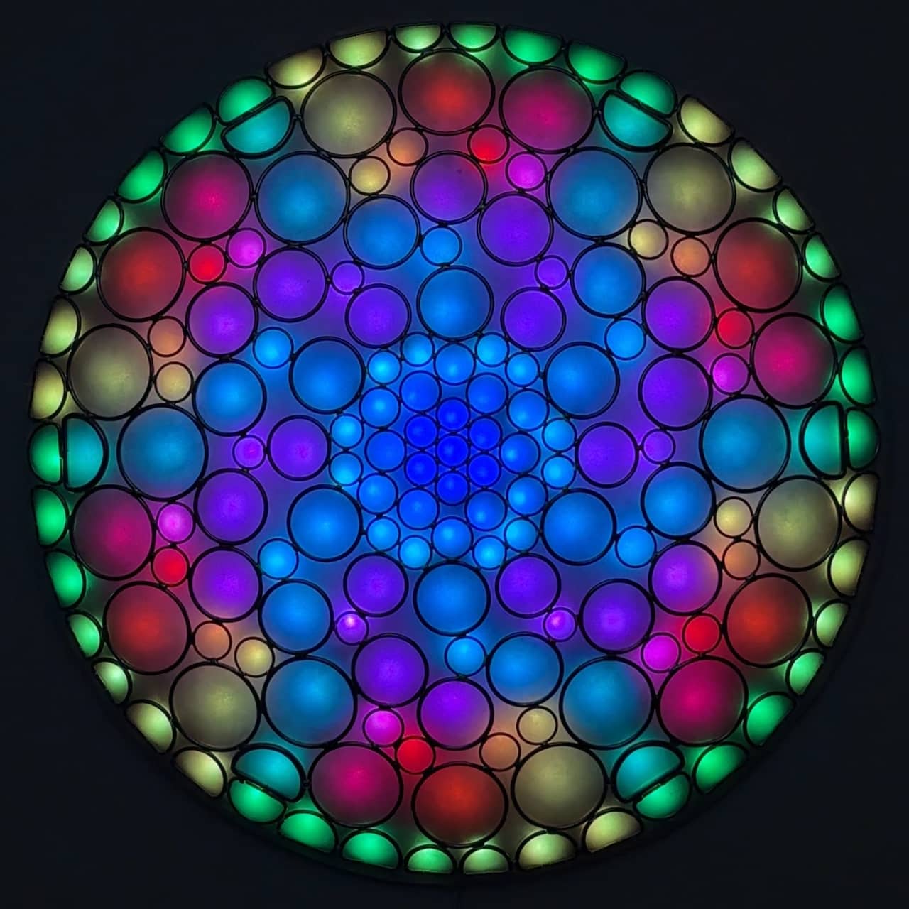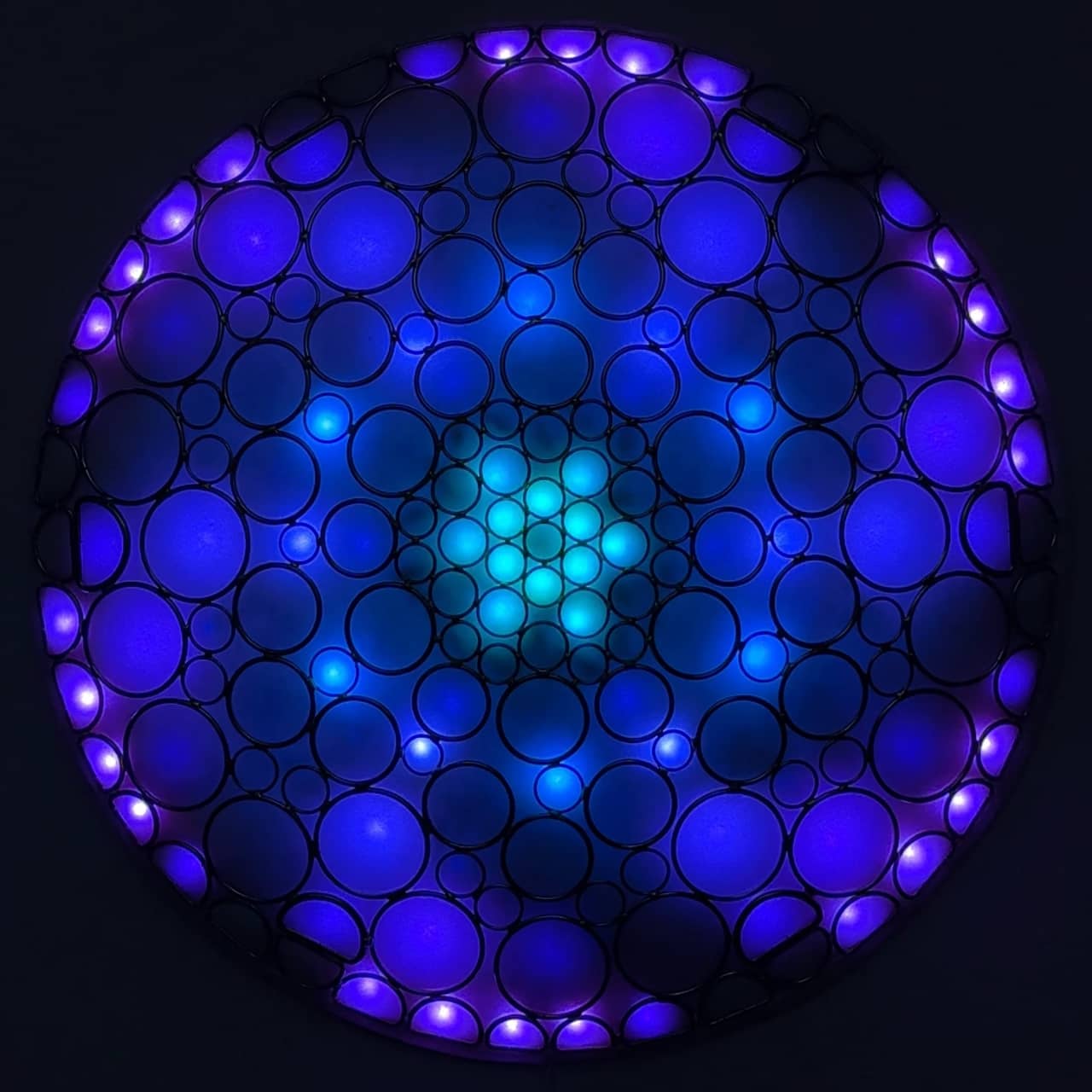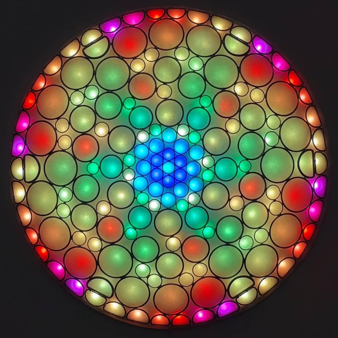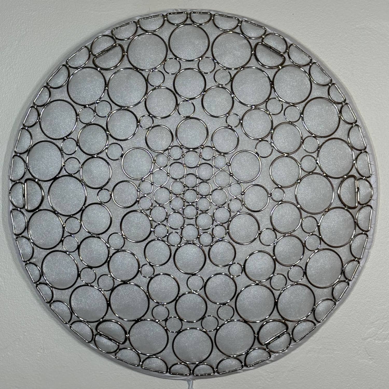 This is part of the Enlighted Rings series of wall-mounted mixed-media art with embedded RGB LEDs. The outermost layer is made with several sizes of silver-colored metal circles and D-rings that have been soldered into a shallow convex dome shape. A fabric diffusing layer is mounted behind the rings, and RGB LED pixels are mounted on an additional internal layer, with one LED aligned with the center of each ring. Some diffused light is also visible through the negative space between rings.