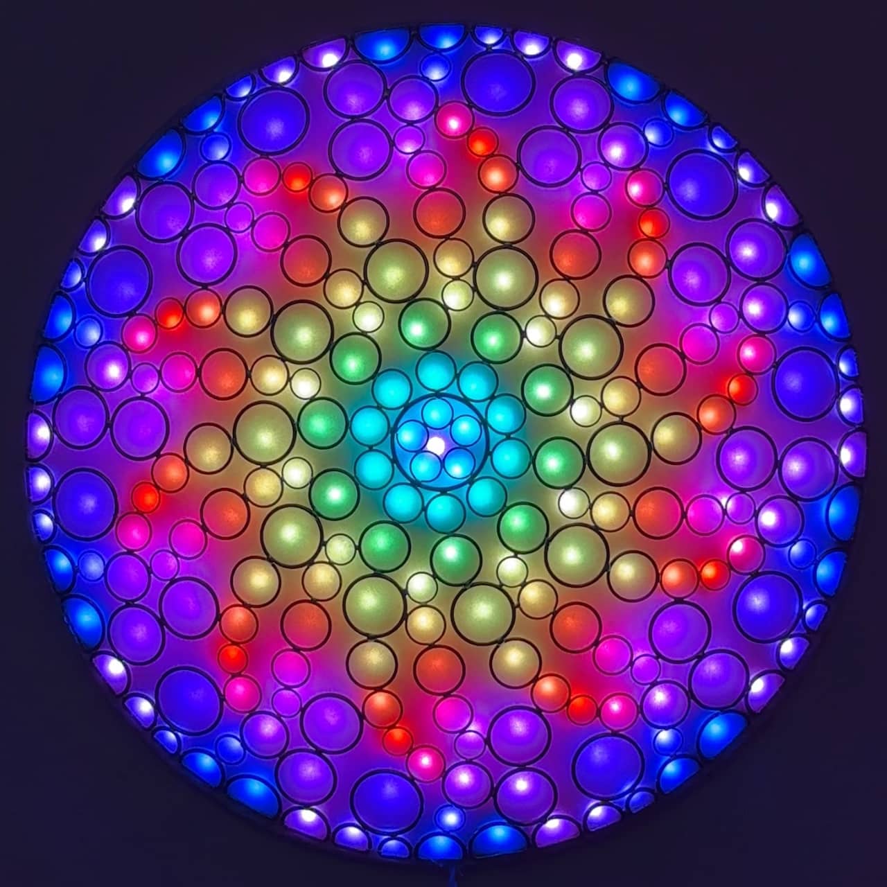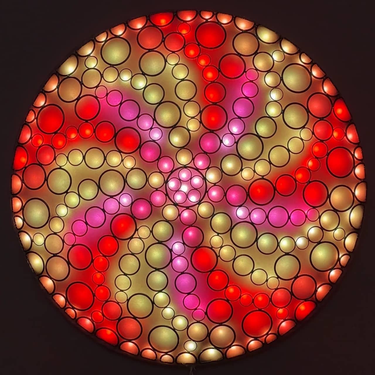 The lights filling the circle are arranged with five-way (and sometimes 10-way) symmetry, and are animated with repeating color sequences that produce a variety of hypnotic patterns and optical illusions.