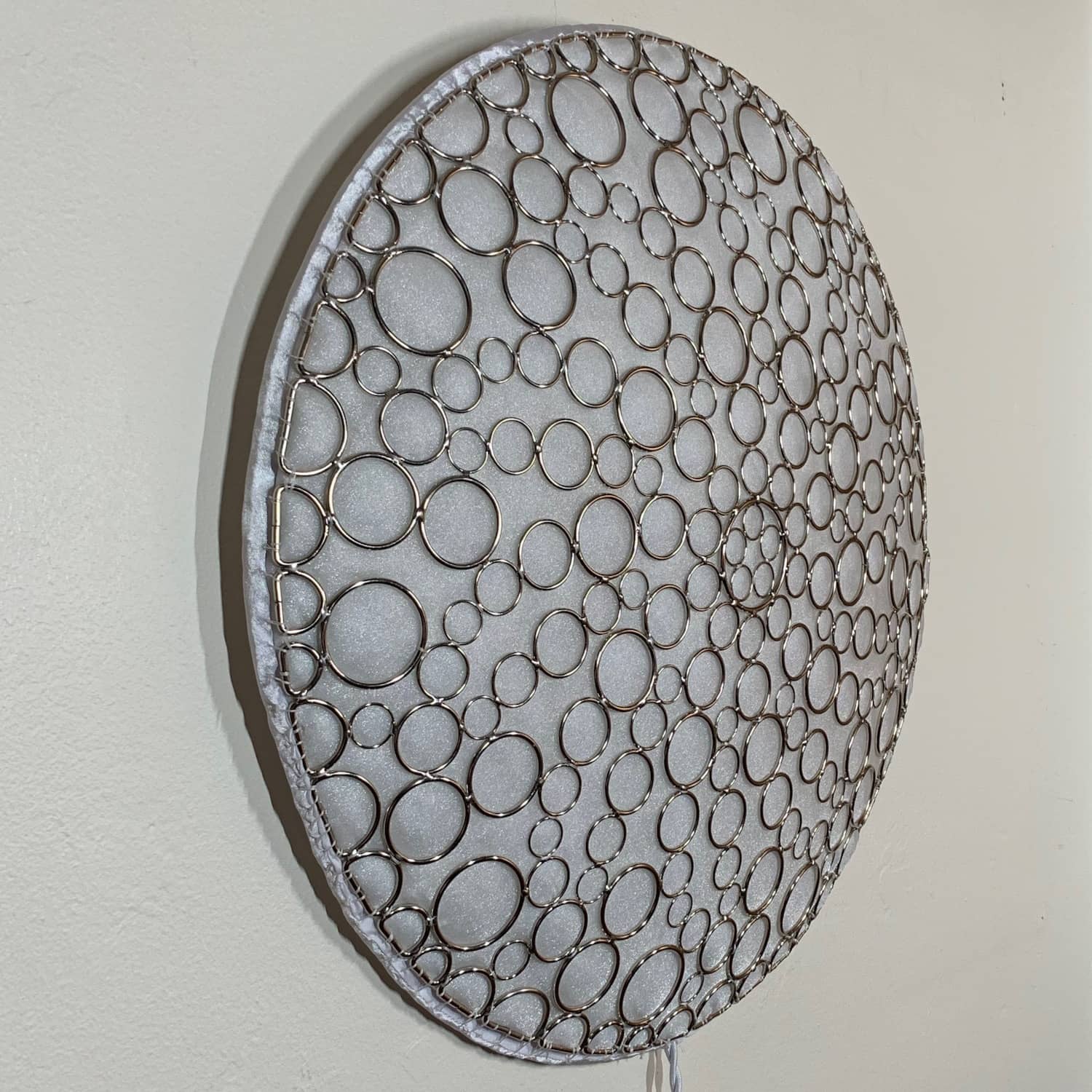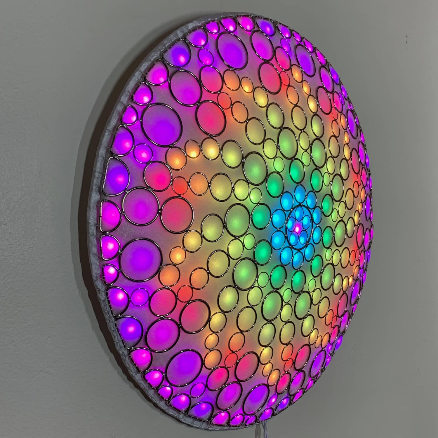This is part of the Enlighted Rings series of wall-mounted mixed-media art with embedded RGB LEDs. The outermost layer is made with several sizes of silver-colored metal circles and D-rings that have been soldered into a shallow convex dome shape. A fabric diffusing layer is mounted behind the rings, and RGB LED pixels are mounted on an additional internal layer, with one LED aligned with the center of each ring. Some diffused light is also visible through the negative space between rings.