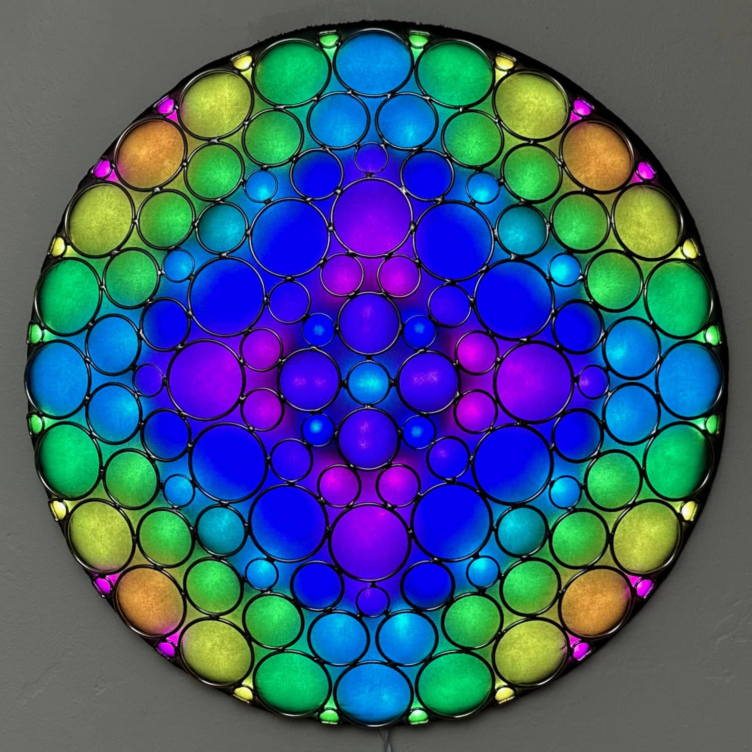 This is part of the Enlighted Rings series of wall-mounted mixed-media art with embedded RGB LEDs. The outermost layer is made with several sizes of silver-colored metal circles and D-rings that have been soldered into a shallow convex dome shape. A fabric diffusing layer is mounted behind the rings, and RGB LED pixels are mounted on an additional internal layer, with one LED aligned with the center of each ring. Some diffused light is also visible through the negative space between rings.