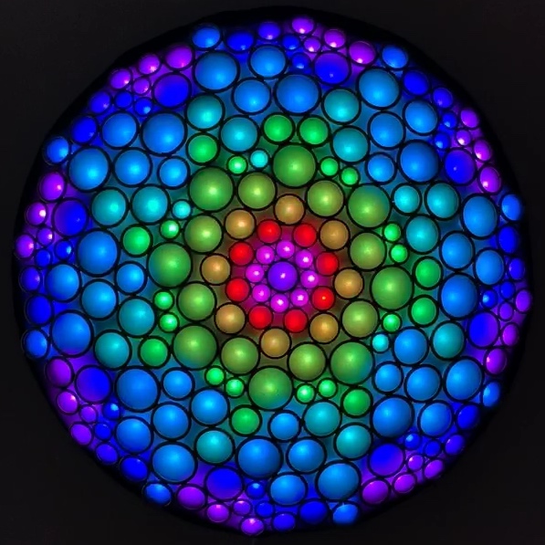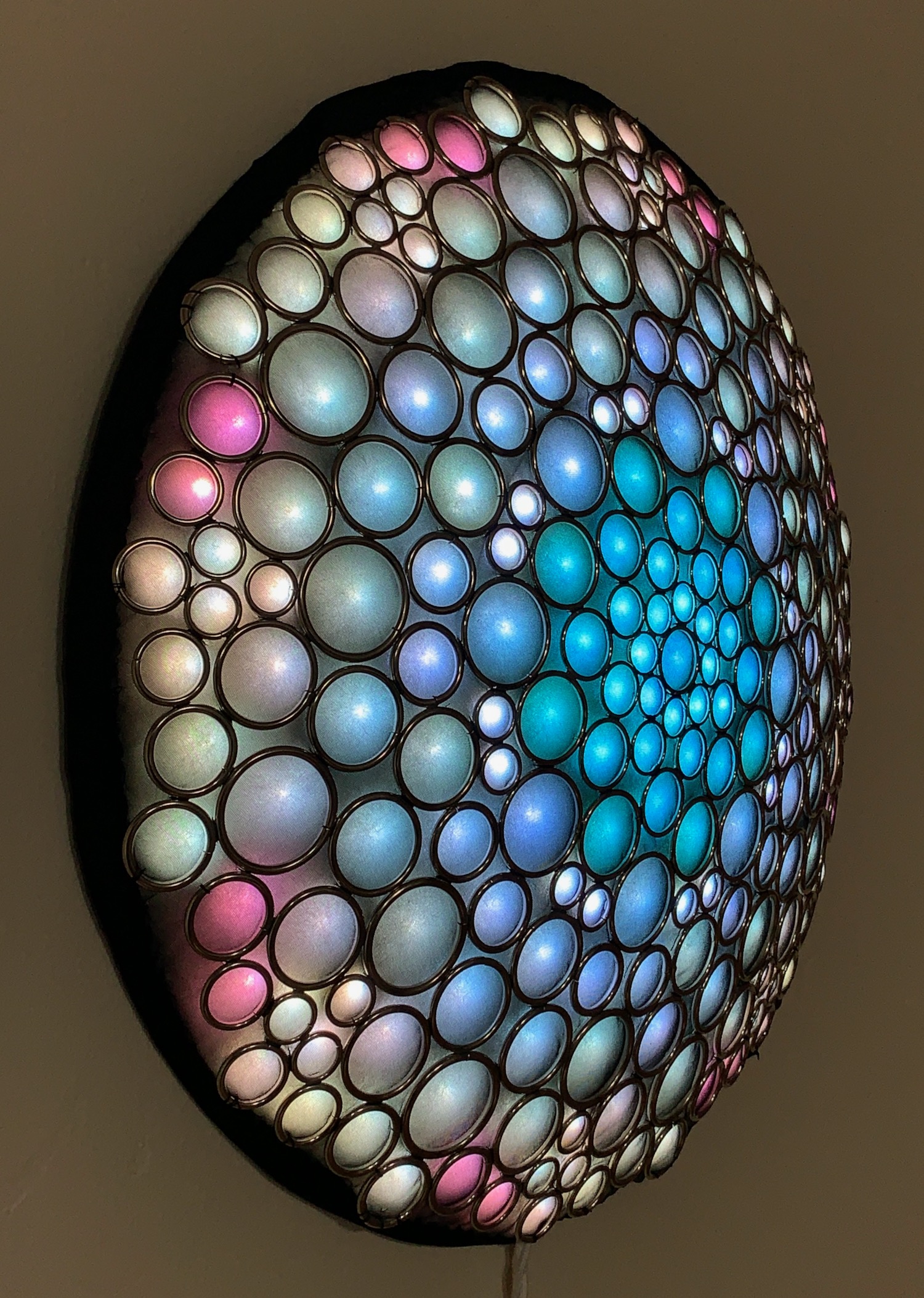 The RGB LED pixels are mounted behind the rings, with one LED near the center of each ring. A layer of black organza and diffusing material lies above the LEDs but behind the steel rings, to partially smooth out the hot spots. Some diffused light is also visible through the negative space between rings.