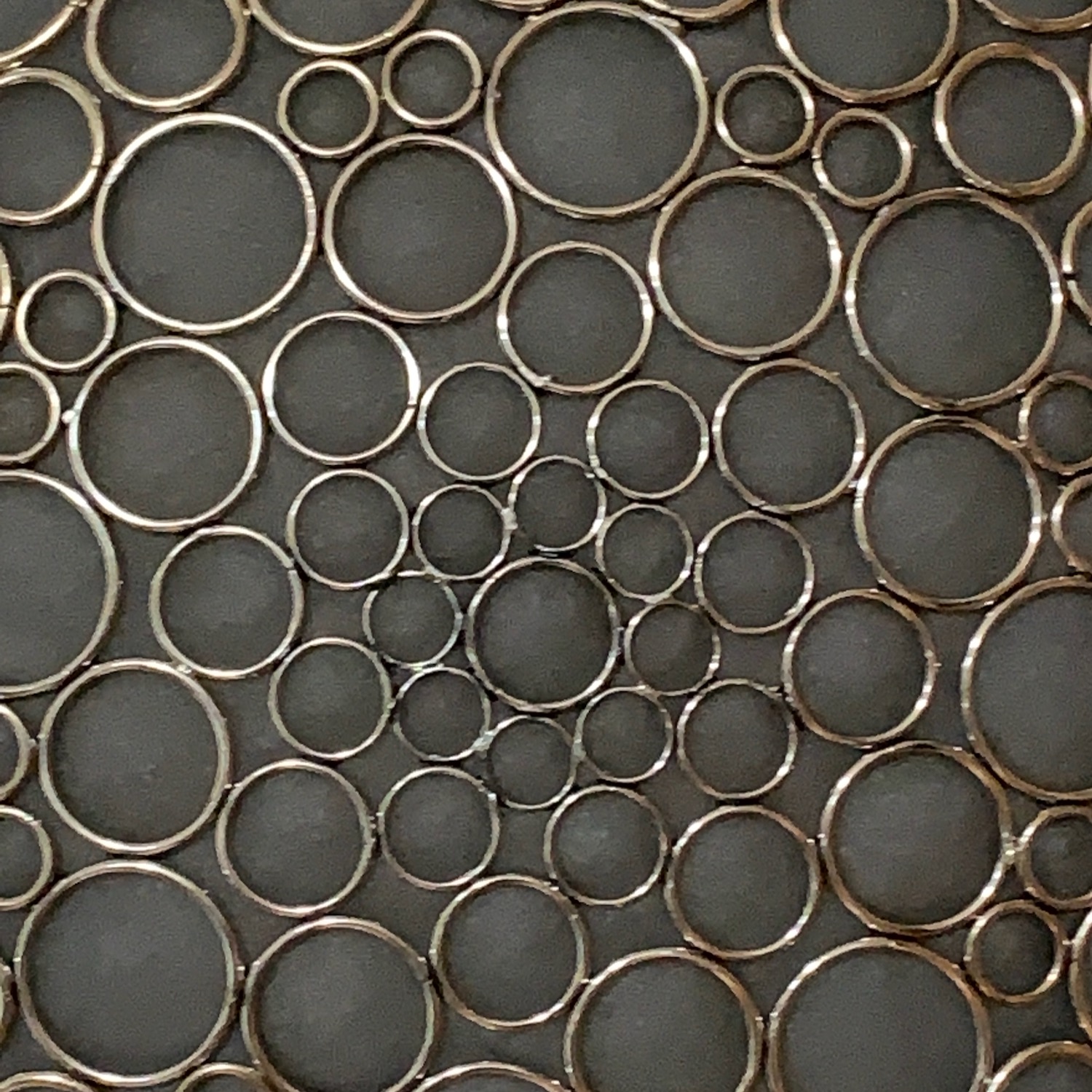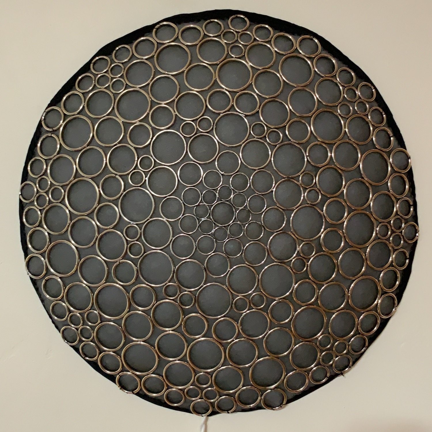 This piece is round, but arches out in the center in a shallow convex dome shape. The outermost layer is made of silver-colored soldered metal rings, and provides most of the structure. The rings are slightly different sizes, and fill in the dome with an 8-way repeating pattern. The back panel is covered in black fabric.