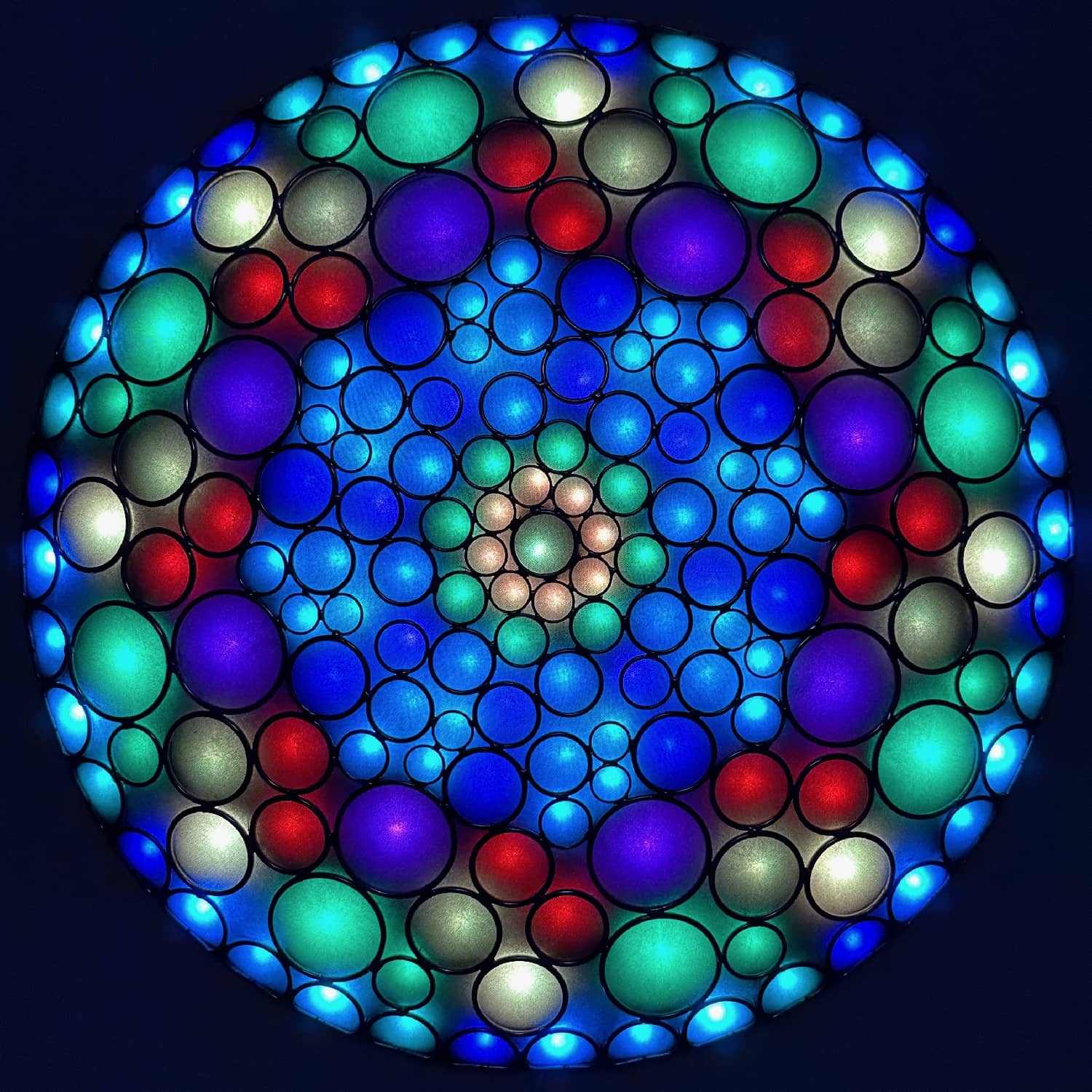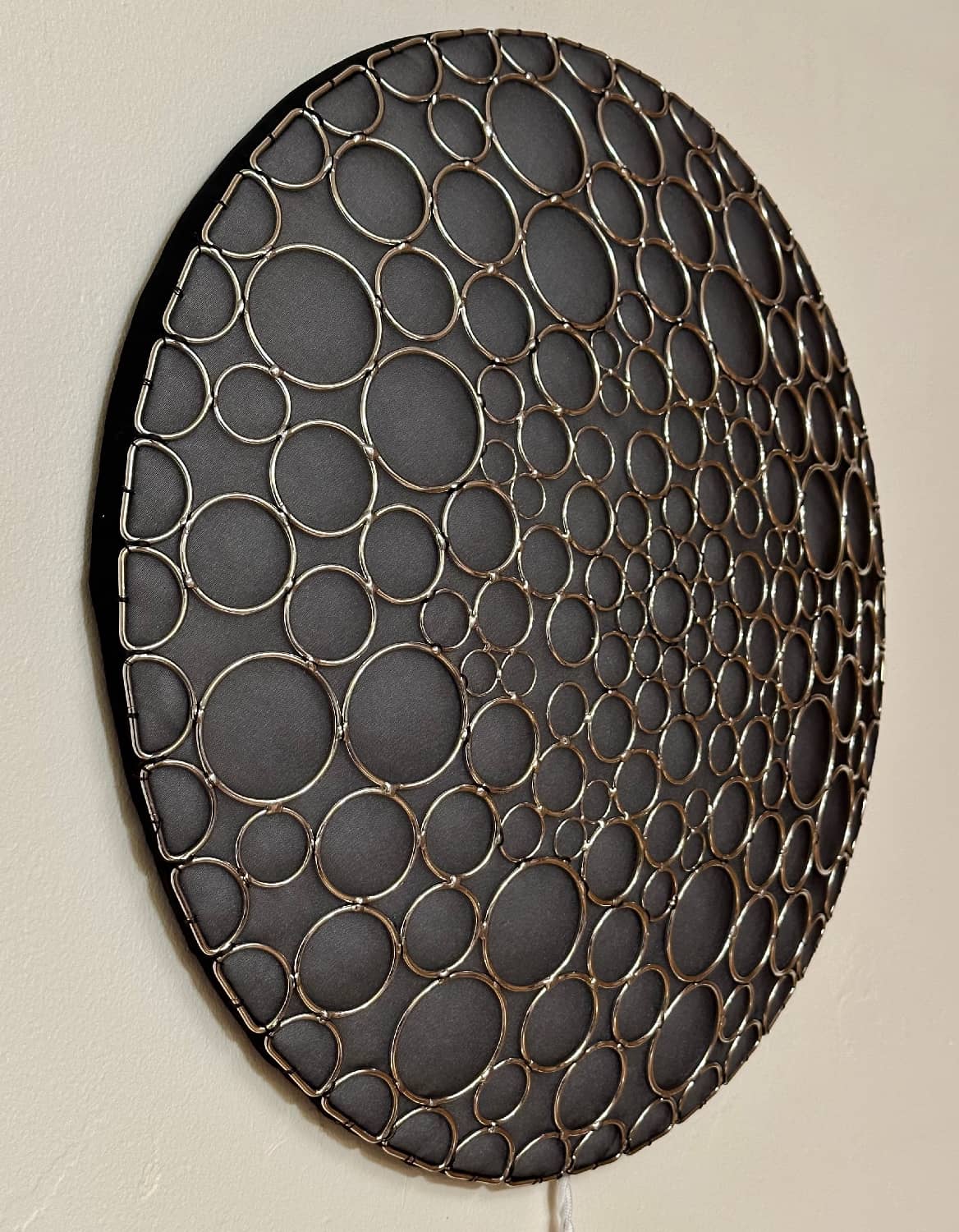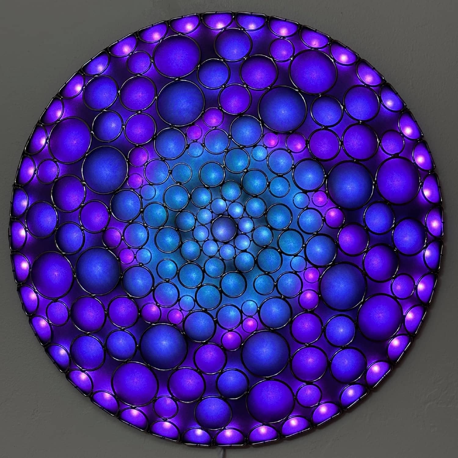 This is part of the Enlighted Rings series of wall-mounted mixed-media art with embedded RGB LEDs. The outermost layer is made with several sizes of silver-colored metal circles and D-rings that have been soldered into a shallow convex dome shape. A fabric diffusing layer is mounted behind the rings, and RGB LED pixels are mounted on an additional internal layer, with one LED aligned with the center of each ring. Some diffused light is also visible through the negative space between rings.