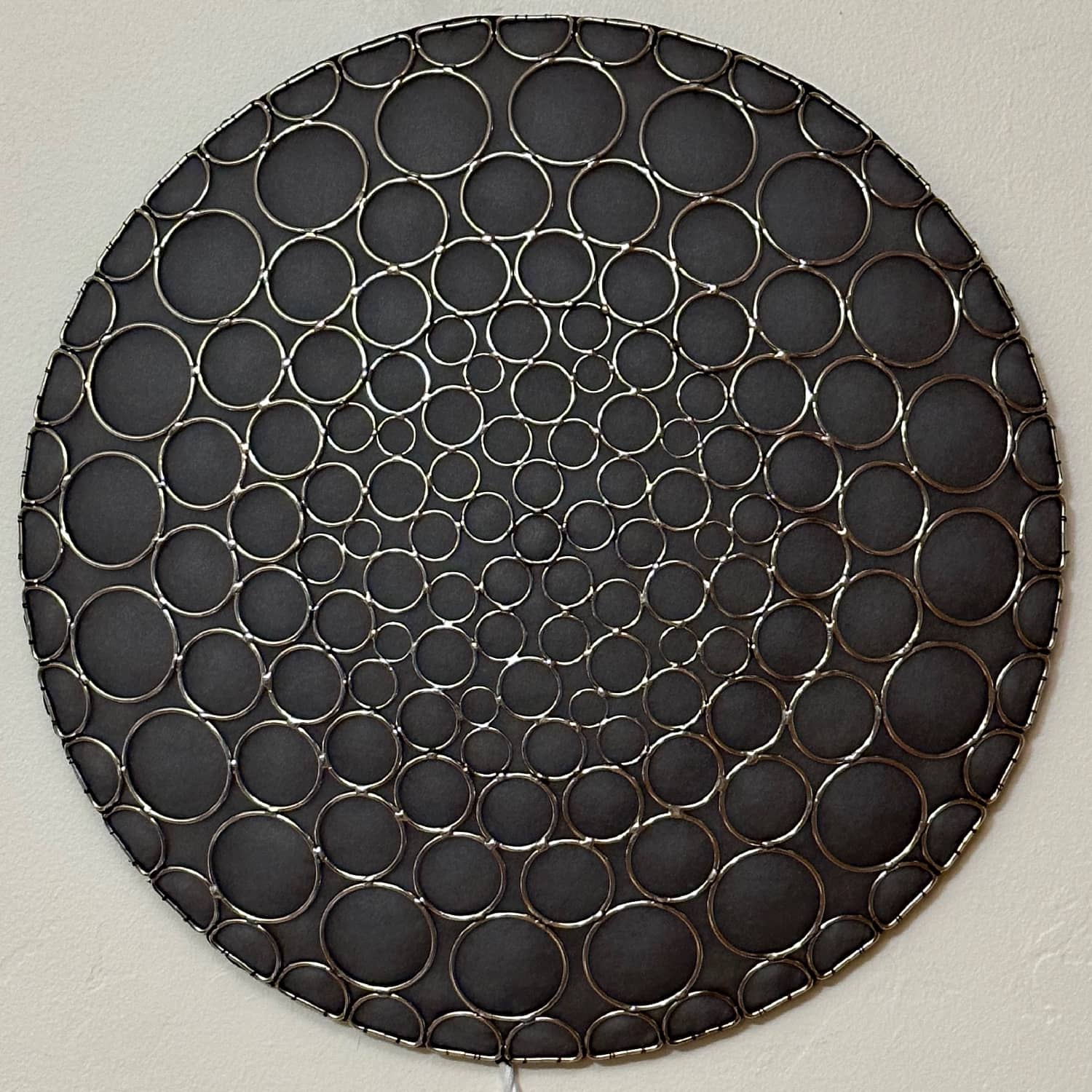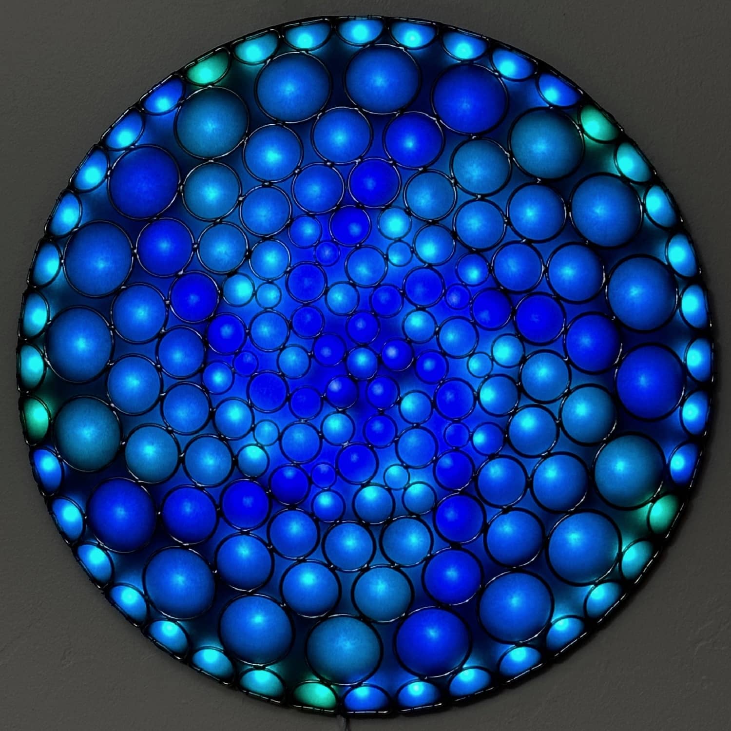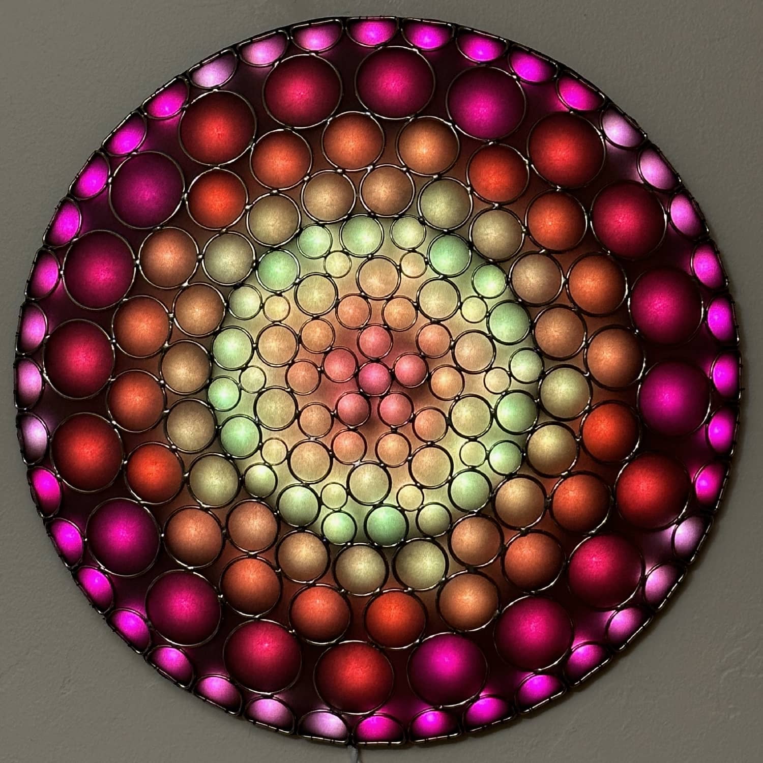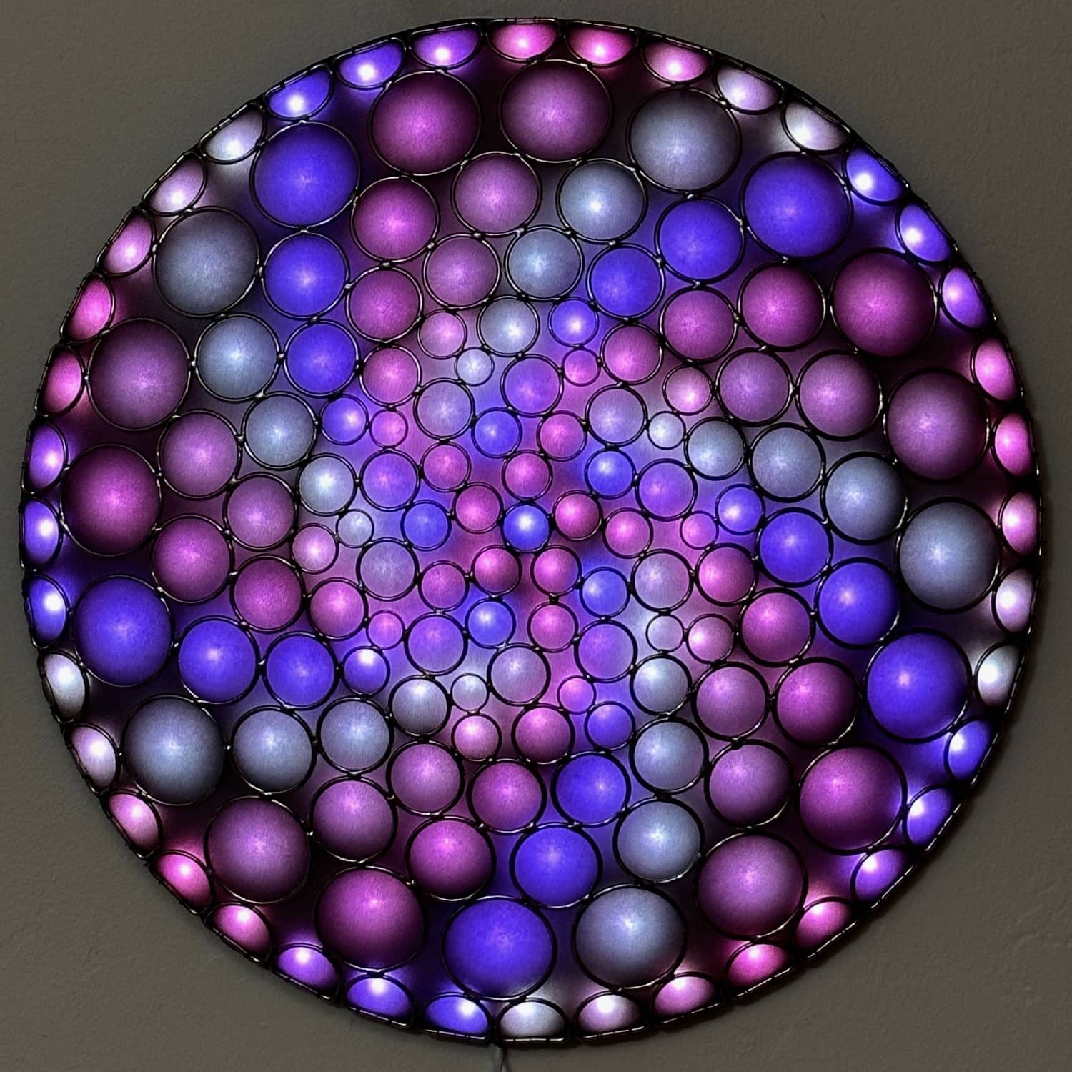 This is part of the Enlighted Rings series of wall-mounted mixed-media art with embedded RGB LEDs. The outermost layer is made with several sizes of silver-colored metal circles and D-rings that have been soldered into a shallow convex dome shape. A fabric diffusing layer is mounted behind the rings, and RGB LED pixels are mounted on an additional internal layer, with one LED aligned with the center of each ring. Some diffused light is also visible through the negative space between rings.