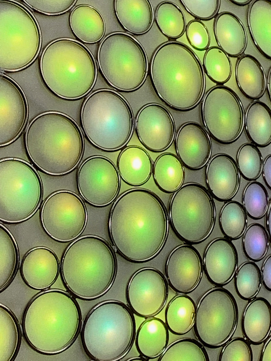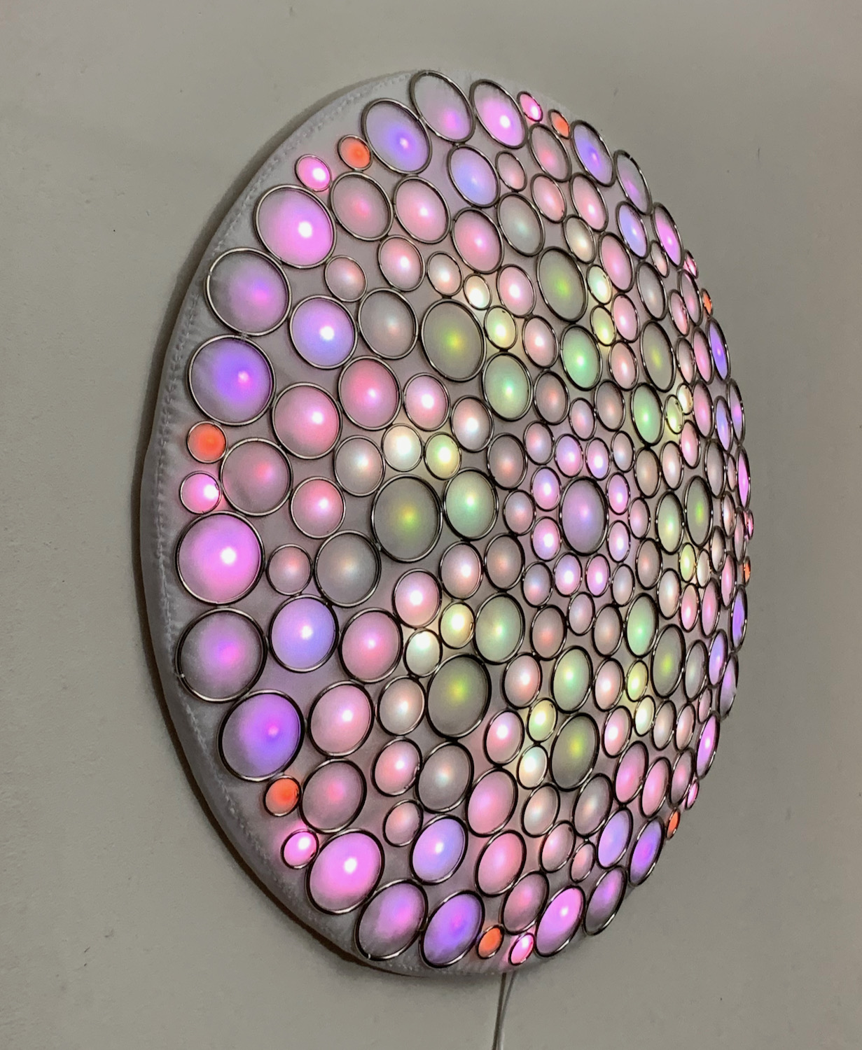 The RGB LED pixels are mounted behind the rings, with one LED near the center of each ring. A layer of white organza and diffusing material lies above the LEDs but behind the steel rings, to partially smooth out the hot spots. Some diffused light is also visible through the negative space between rings.