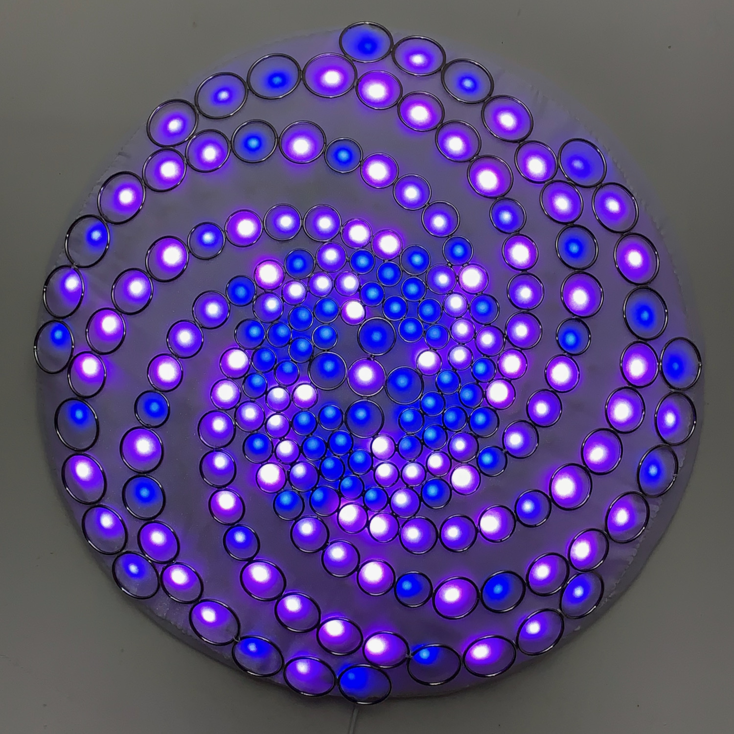 The RGB LED pixels are mounted behind the rings, with one LED near the center of each ring. A layer of white organza and diffusing material lies above the LEDs but behind the steel rings, to partially smooth out the hot spots. Some diffused light is also visible through the negative space between rings.