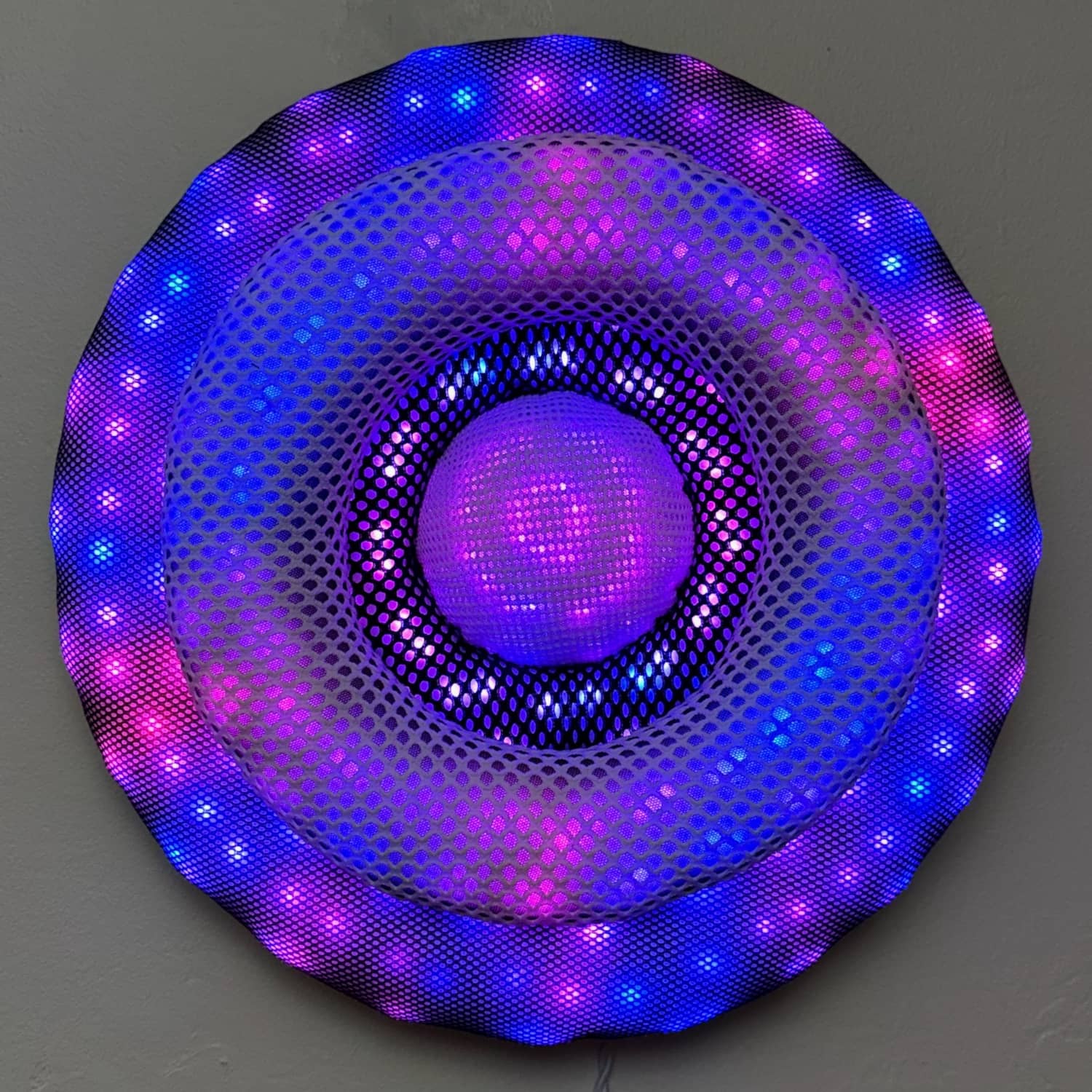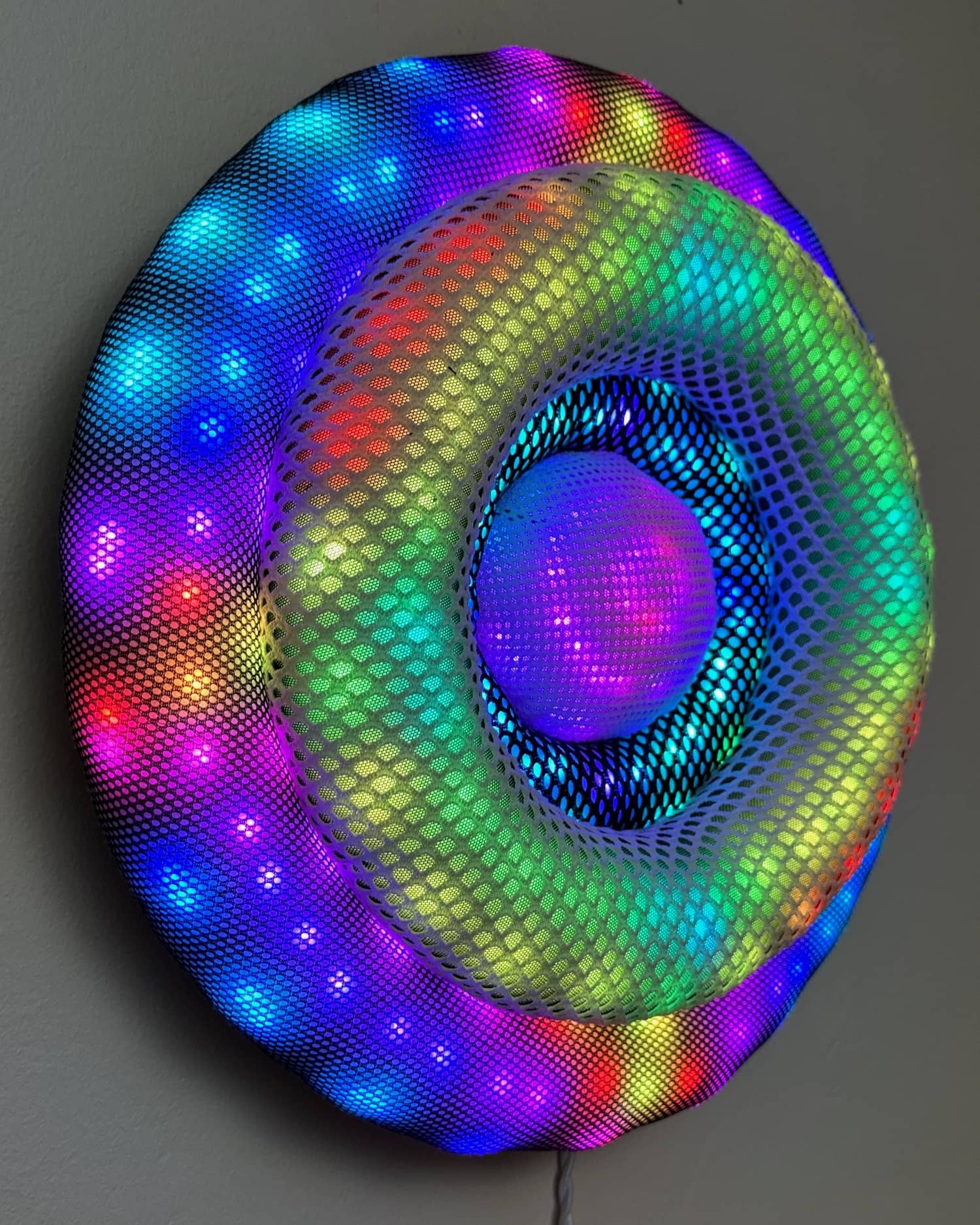 This piece is part of a series made with nested toroid shapes. The outer surfaces are illuminated with RGB LEDs and covered with a fabric diffusing layer as well as various contrasting colors of mesh fabric. Enlighted Toroid 3 has alternating rings with a light or dark background and a constrasting mesh overlay.