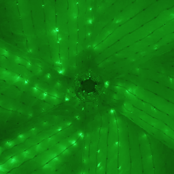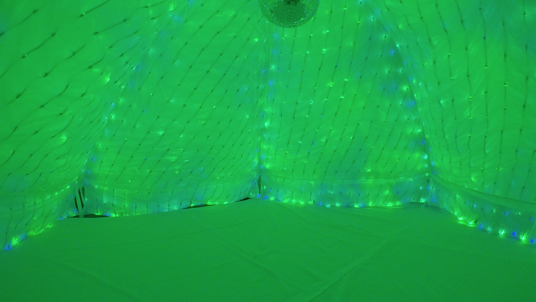 The piece can also be enjoyed from the inside, by lifting one of the lower flaps and crawling underneath. The reflected internal light creates an immersive environment suitable for dynamic color therapy, relaxation, or whatever form of "escape" is needed. A mirrored ball hanging in the center adds a festive touch.