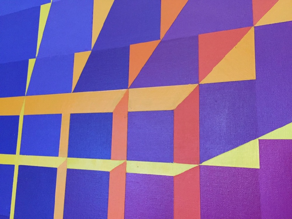 The first assignment was to create a grid and paint each region a distinct solid color, and to explore the boundaries and interactions between the edges. Several students who wanted to do landscapes were miserable, but Janet enjoyed the project so much that she continued to work in this style, and explored other types of grids to study depth effects.