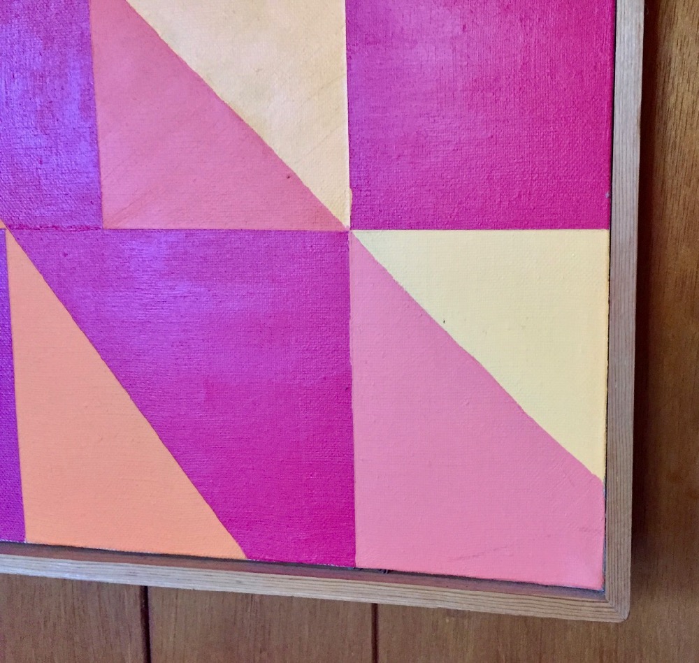 This piece represents the artist's introduction into what would become one of her favorite styles of abstract painting. As an engineering student at Harvey Mudd College, she had access to classes at the other Claremont schools, including painting at Pomona College. Janet took several classes from Karl Benjamin, who specialized in geometric abstractions, painted in a hard-edge colorist style.