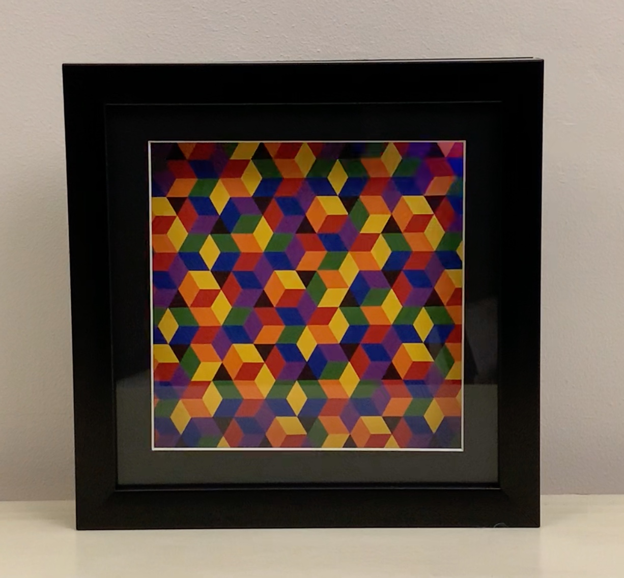 As the light color changes, the printed image appears to move and change. The graphic used in this case is a square-cropped version of an abstract geometric design created by the artist in 1996 (see Open Hexagonal Lattice I for information about the original acrylic on canvas version). While the Escher-esque impossible shape illusion is noticeable in the original, it becomes even more dramatic when viewed under sweeps of rotating color.