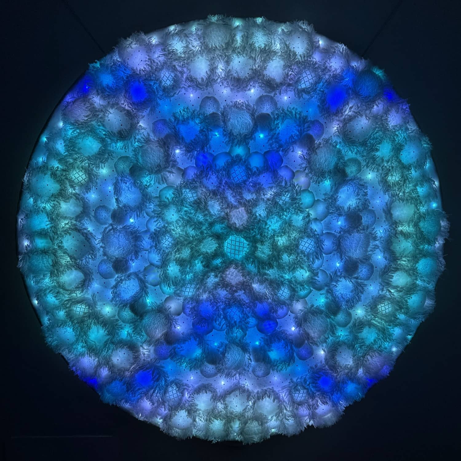 This is one of three parts of the Kaleidoscopic Comfort installation created for Mirror Mirror, the 2025 temporary art exhibition at the San Diego International Airport. The mixed-media wall-mounted art is illuminated by an internal layer of RGB LEDs arranged in a geometric pattern. The light is diffused by an assemblage of fabric shapes that are sewn together and aligned over the front of the LEDs. This piece uses a variety of white faux fur and sheer mesh textiles with some reflective accents.