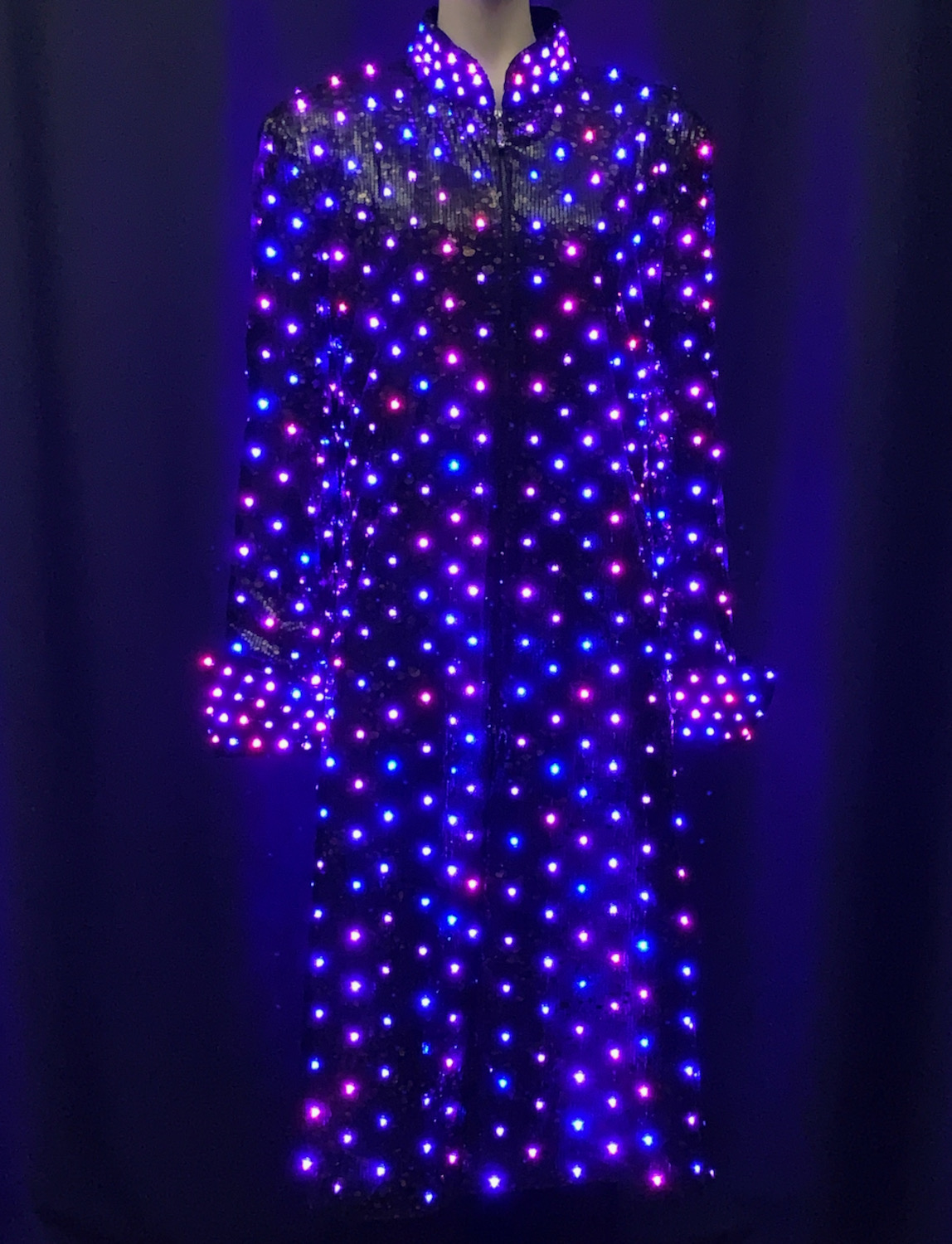 This custom coat is decorated with over 1000 RGB LED pixels mounted on the front, back, arms and collar. The entire coat is covered with a sheer black mesh with mini sequins, to conceal the wiring while letting light pass through.