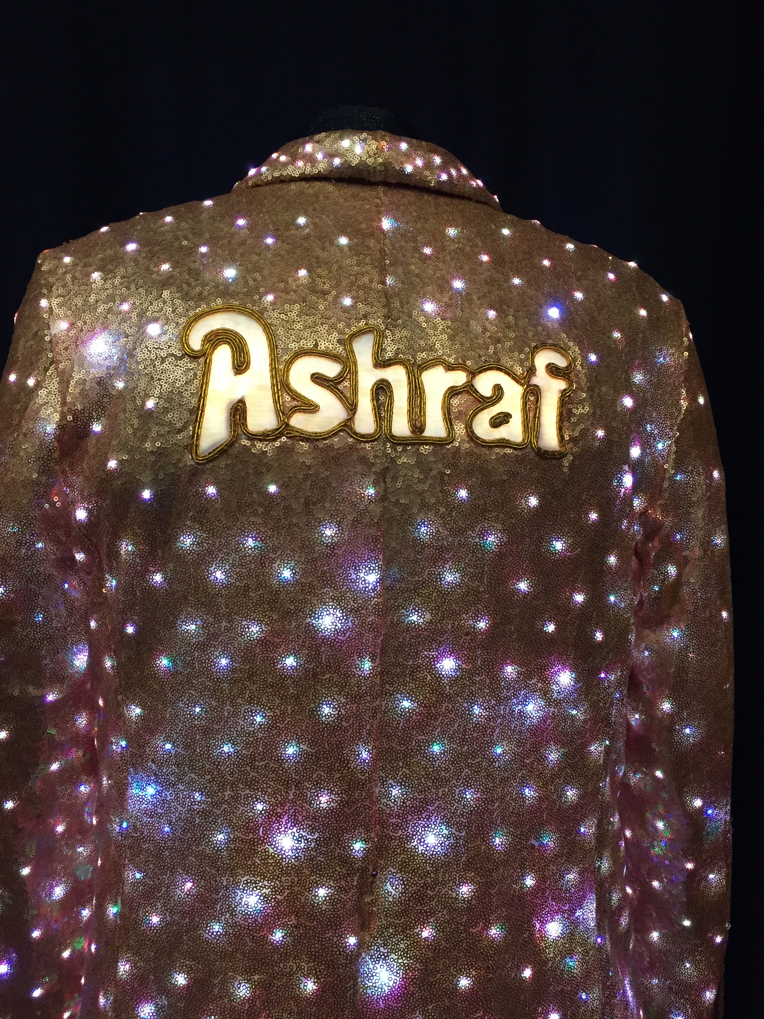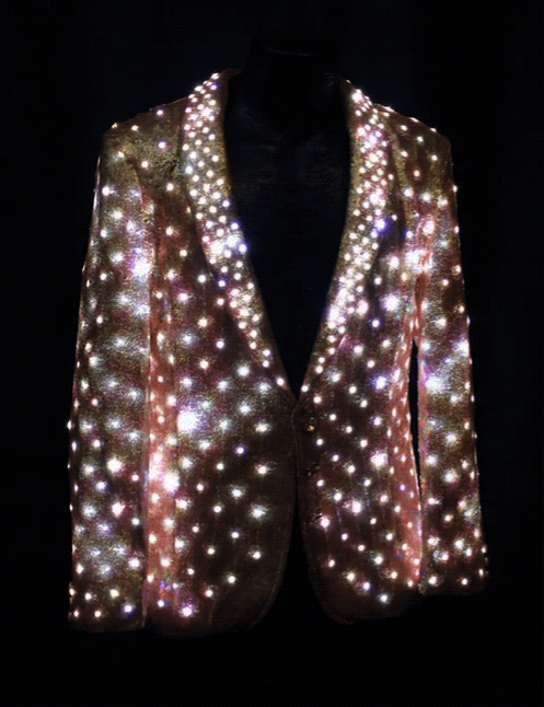 This custom jacket is decorated with about 1000 RGB LED pixels covering the front, back, arms and collar. The name 'Ashraf' is also illuminated on the back, with RGB LED backlighting behind sheer embroidered letters. The entire coat is covered with a sheer gold mesh with mini sequins, to conceal the wiring while letting light pass through.