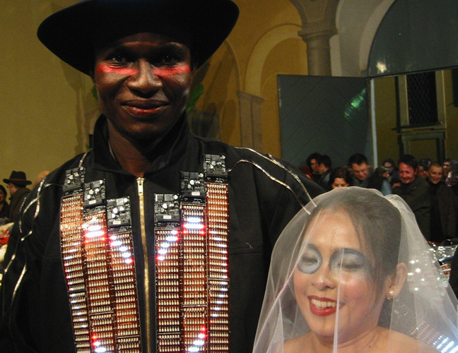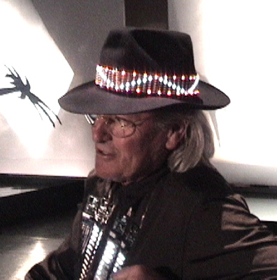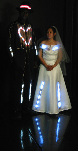 The clothing was decorated with illuminated scrolling text and graphics, with messages of love and philosophical musings, using surface-mounted LEDs on flexible circuit boards. This installation was the earliest demonstration of wearable animated displays with such a high degree of complexity, with thousands of lights per outfit.