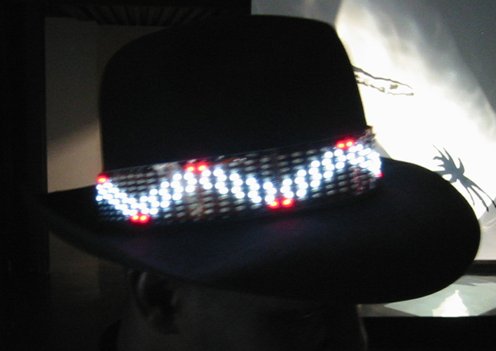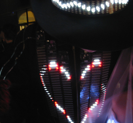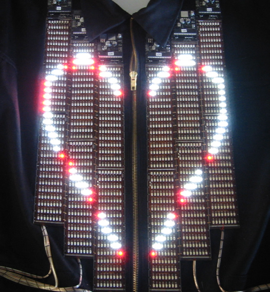 This vest contains over 1000 blue and white LEDs on flexible panels. The lights are used to display scrolling text messages, as well as abstract animation.