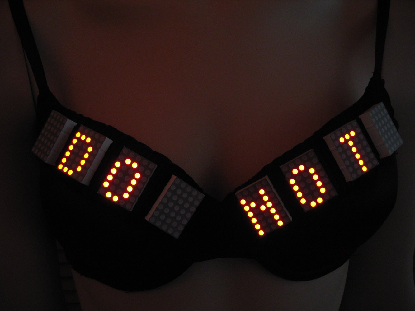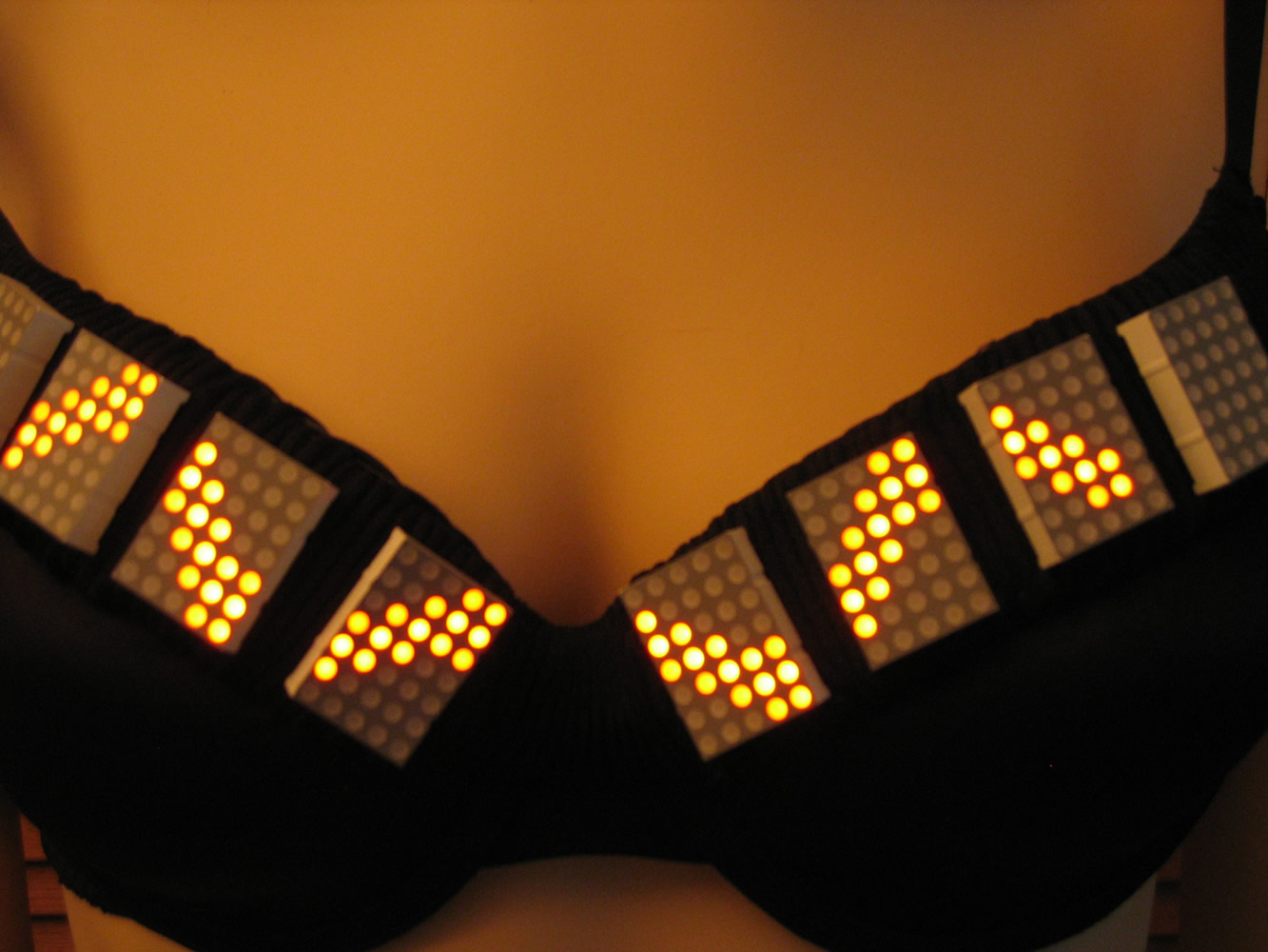 8 LED arrays (5x7 pixels each), mounted on a black bra