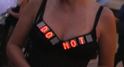 A performance art piece, challenging the viewer to NOT look at the blinky light-up message on the model's cleavage. The entire animated scrolling message moves very slowly, and reads: