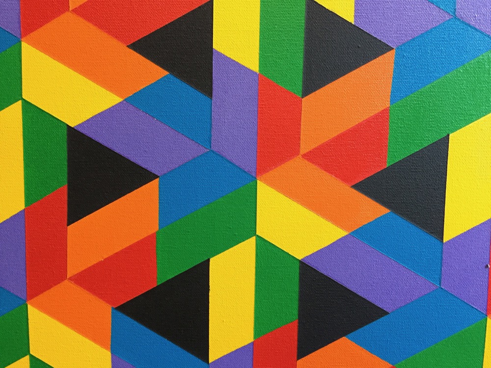 This is a variation of Open Hexagonal Lattice I, with the edge lengths increased and the open black "holes" expanded. Colors are arranged so that complementary colors are adjacent to one another when you move along the length of a span (red/green, orange/blue, yellow/purple). Moving around a span, colors are grouped as neighboring pairs (red/orange, orange/yellow, etc...).