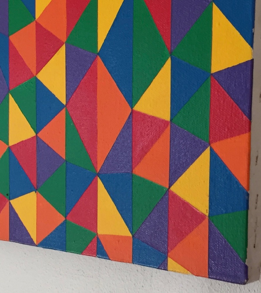 Like Random Triangular I, this painting is also based on a Delaunay triangulation. The seed vertices are points from a series of sinusoidal functions with regular x-axis spacing. This regular spacing creates the vertical lines in the picture. Some people see a scary clown face, but that part wasn't intentional.