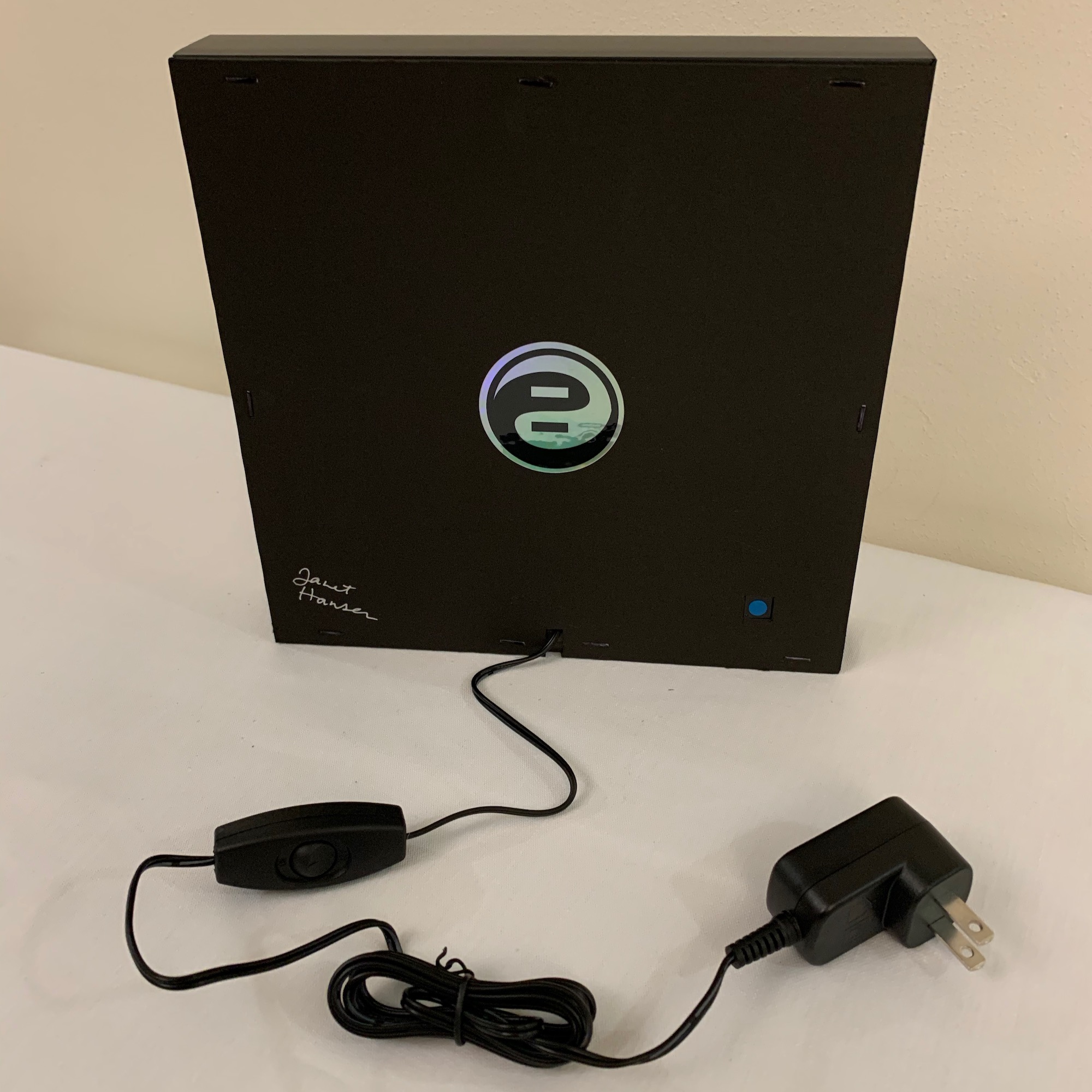 The piece is powered by an AC adapter with a 6' black extenson cord, with an inline on/off switch about 1' away from the end with the frame. A small mode switch is built into the back, allowing the light effects to be changed between these settings:
