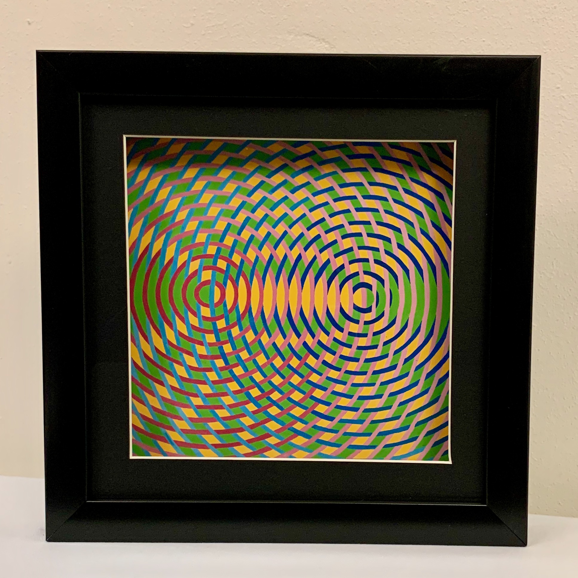 As the light color changes, the printed image appears to move and change. The graphic used in this case is an abstract geometric design created by the artist in 2001 (see Anxiety for information about the original acrylic on canvas version). The rotating lights have a calming effect, so the name has been changed for this mixed-media version.
