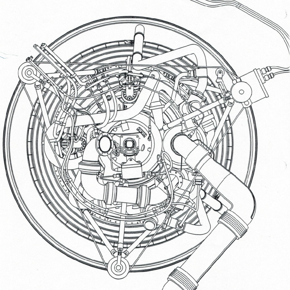 This is a colorful rendition of the second-stage rocket engine of the Delta III (which is also used in the Delta IV, with some variations). This is an end view, looking down toward fuel lines, pumps, and a pulley system that deploys an extendible carbon-carbon nozzle. The satellite payload would be attached at the center, coming out of the canvas.