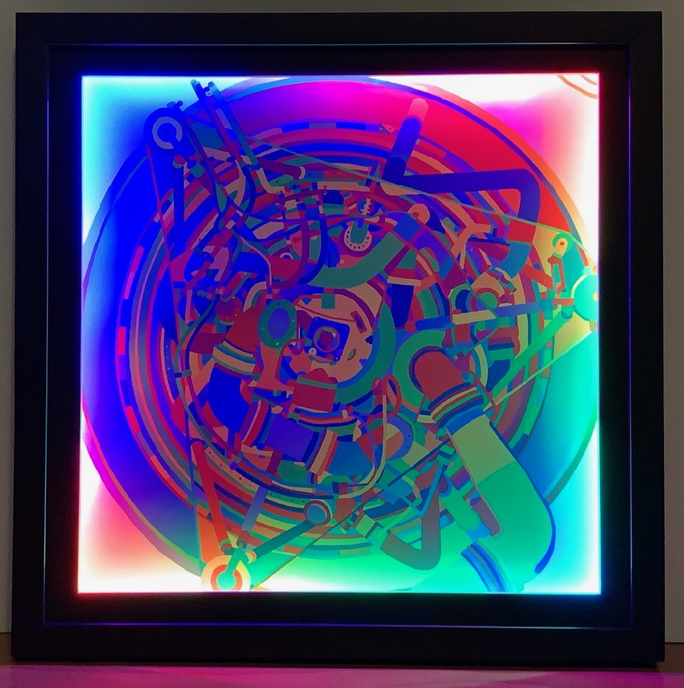 This piece plays with the effects of color-changing light on multi-colored pigments, and combines modern RGB LED illumination techniques with a graphic created by the artist in 1998 (see Rocket for information about the original acrylic on canvas version).