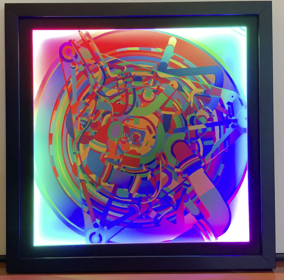 The LED light sources are built into the edges of the frame, and the custom control electronics are mounted behind the image (also inside the frame).