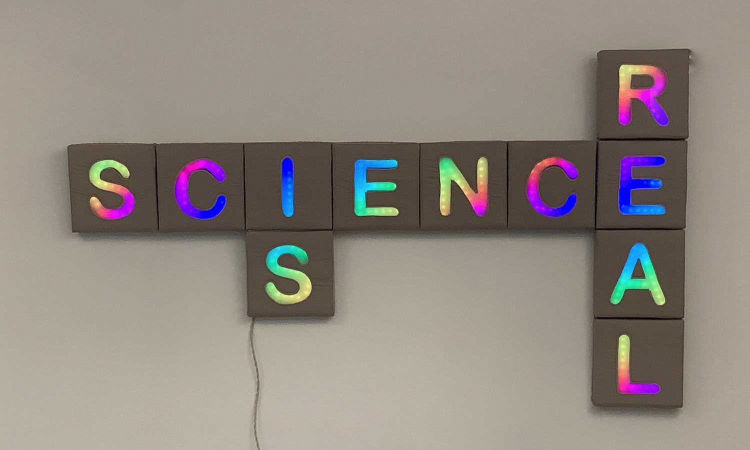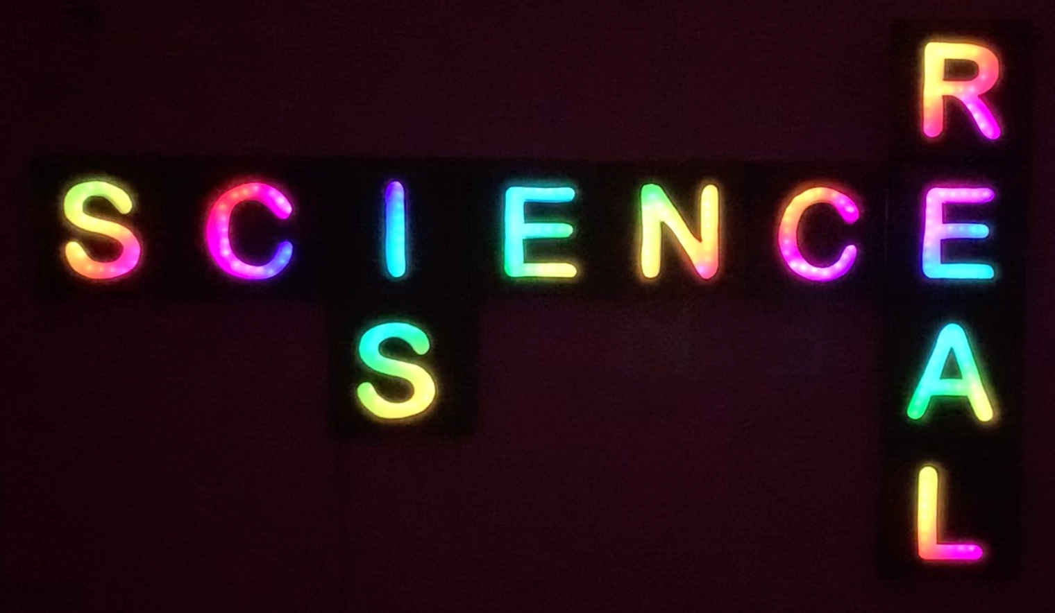 This piece, designed and built mid-pandemic, celebrates the value of evidence-based research with a simple message: Science Is Real. The artist found it therapeutic to build this piece during a time when far too many people are ignoring the recommendations of highly-trained experts, and falling victim to fear-mongering scammers and conspiracy theorists. It should not be controversial to be pro-science, pro-medicine, and pro-vaccine, but here we are.