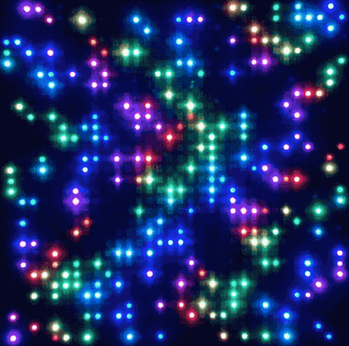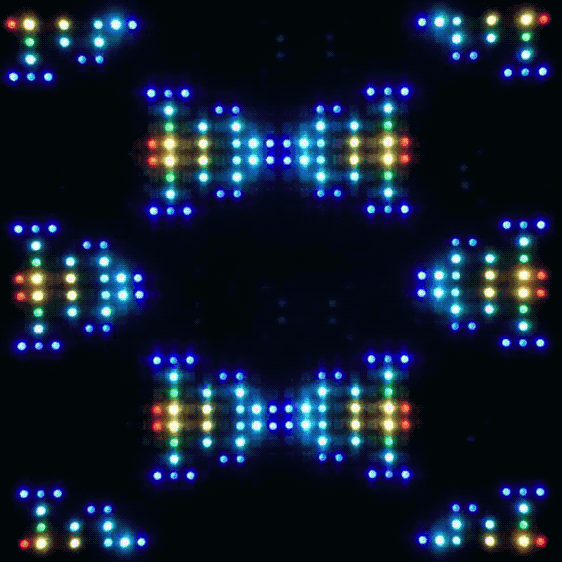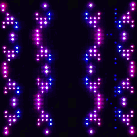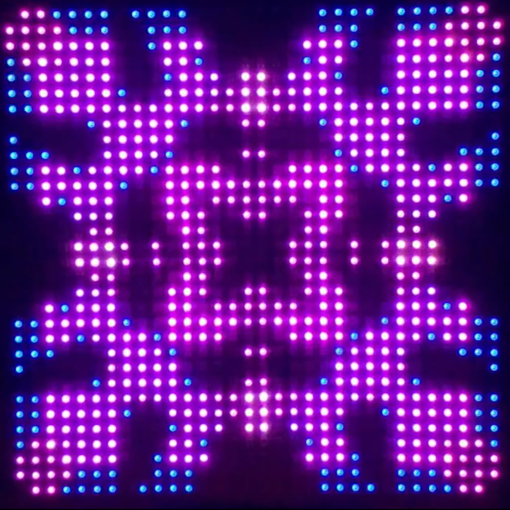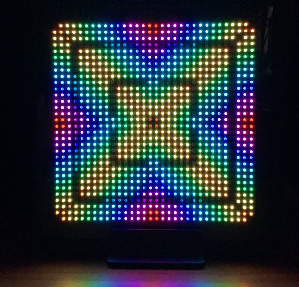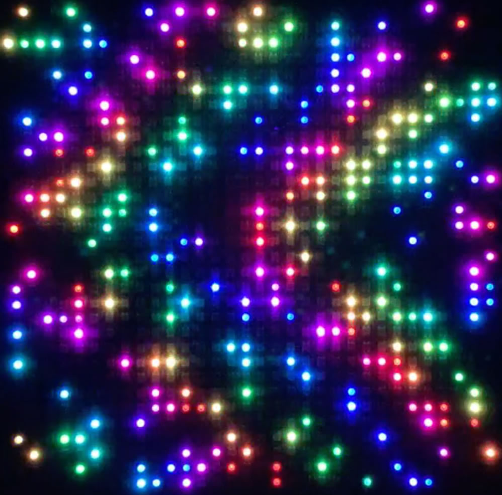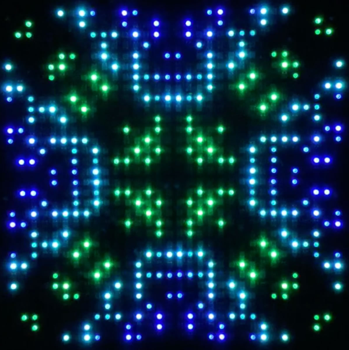 The RGB LED pixels are animated in a variety of hypnotic geometric patterns, many of which are also sound-reactive. The animation mode can be selected with a manual switch on the back of the frame, or with the Enlighted iOS app, which also allows customization of the colors. The frame can be hung on the wall, or held in an optional stand.