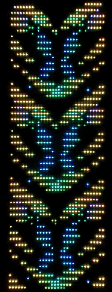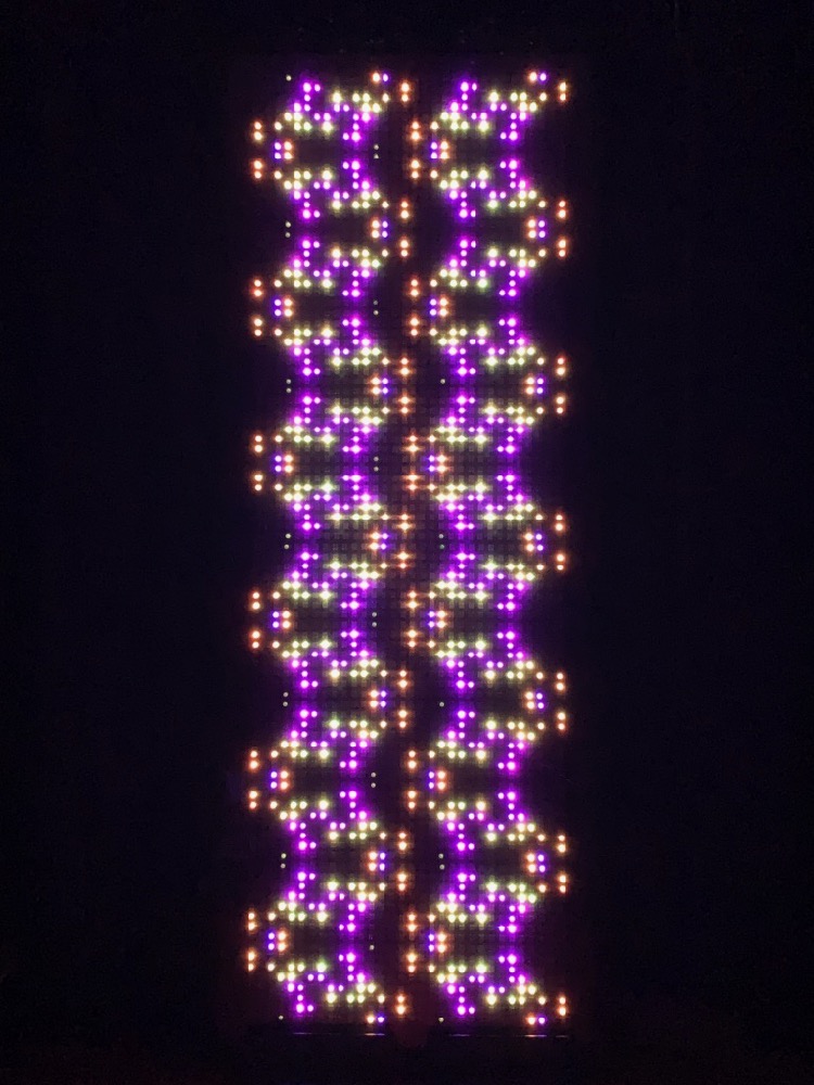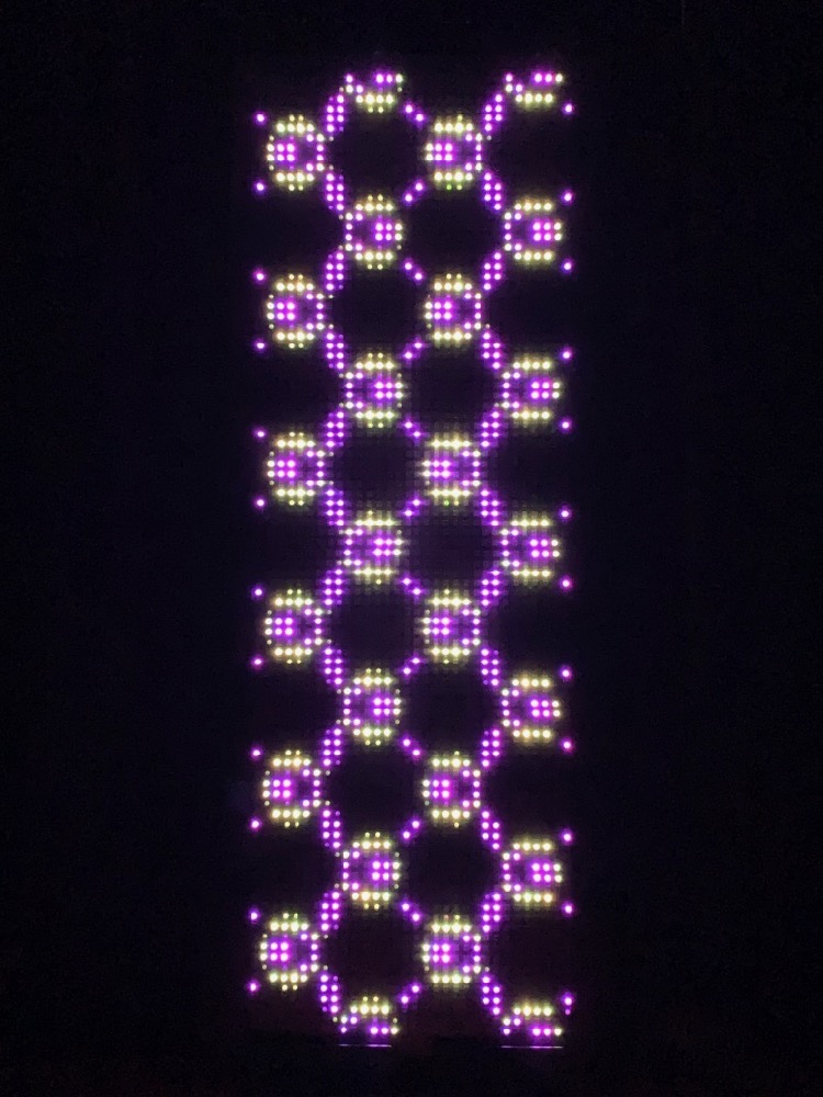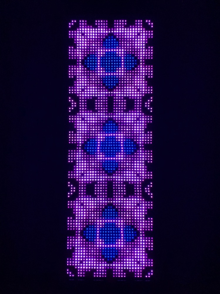 The RGB LED pixels are animated in a variety of hypnotic geometric patterns, many of which are also sound-reactive. The animation mode can be selected with a manual switch on the back of the frame, or with the Enlighted iOS app, which also allows customization of the colors.