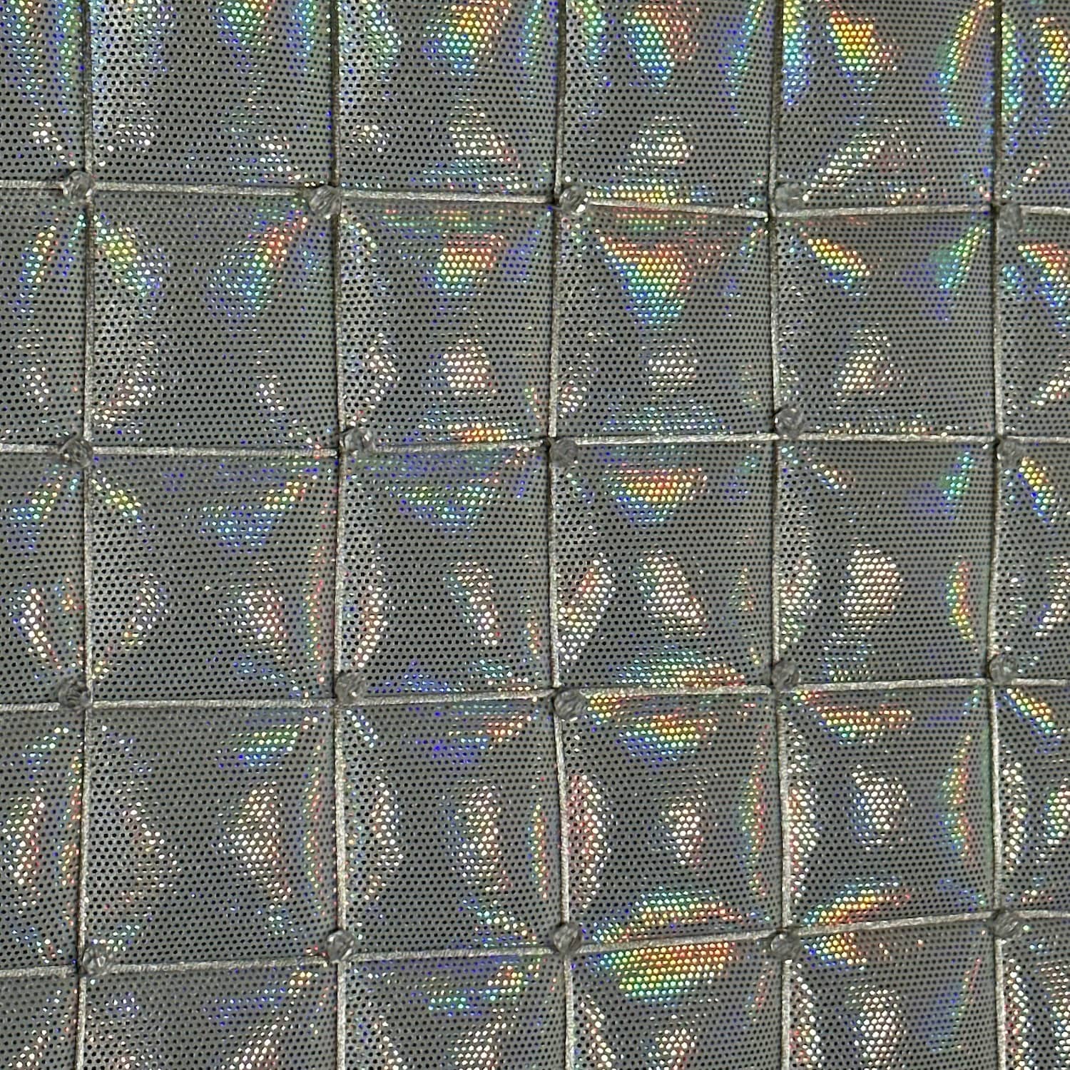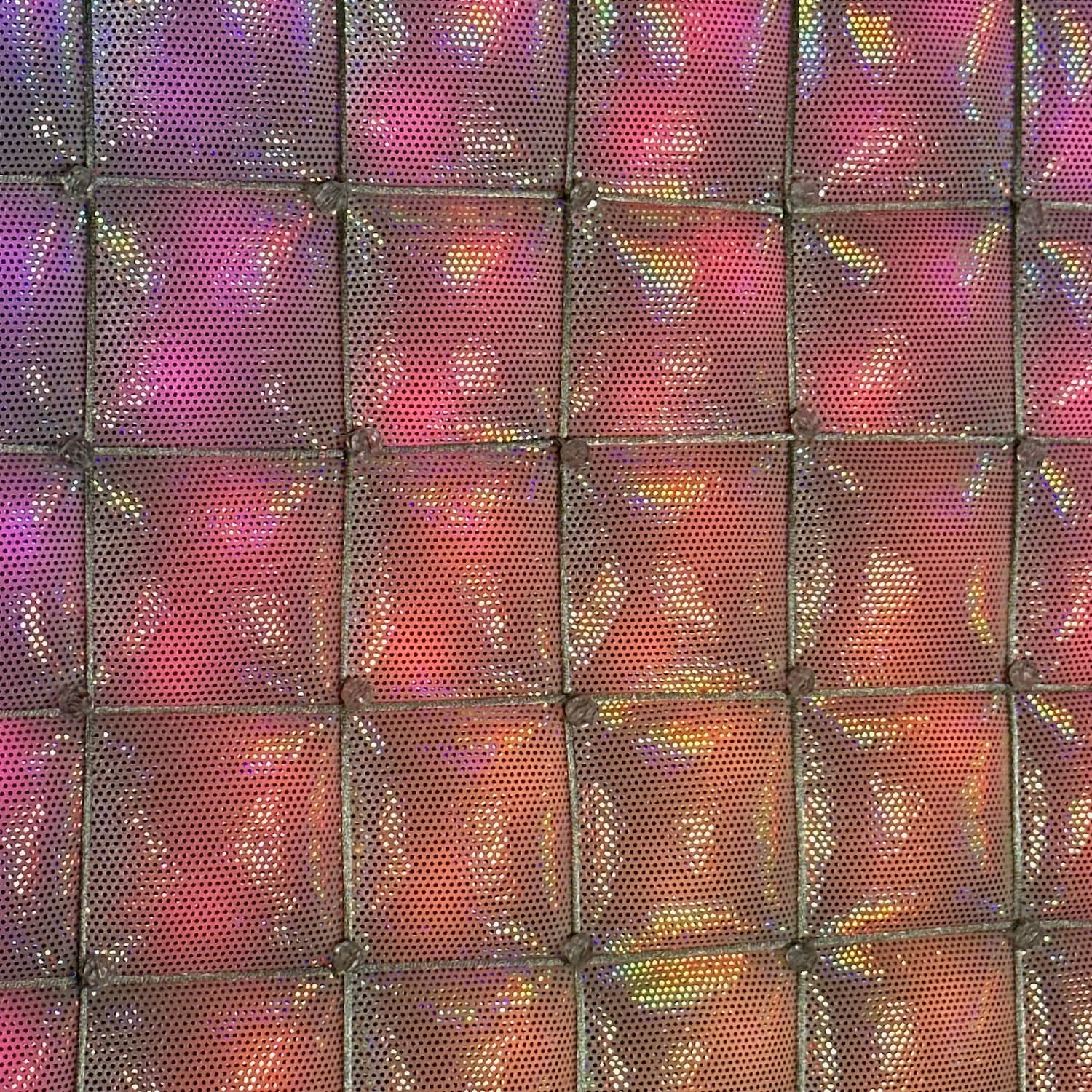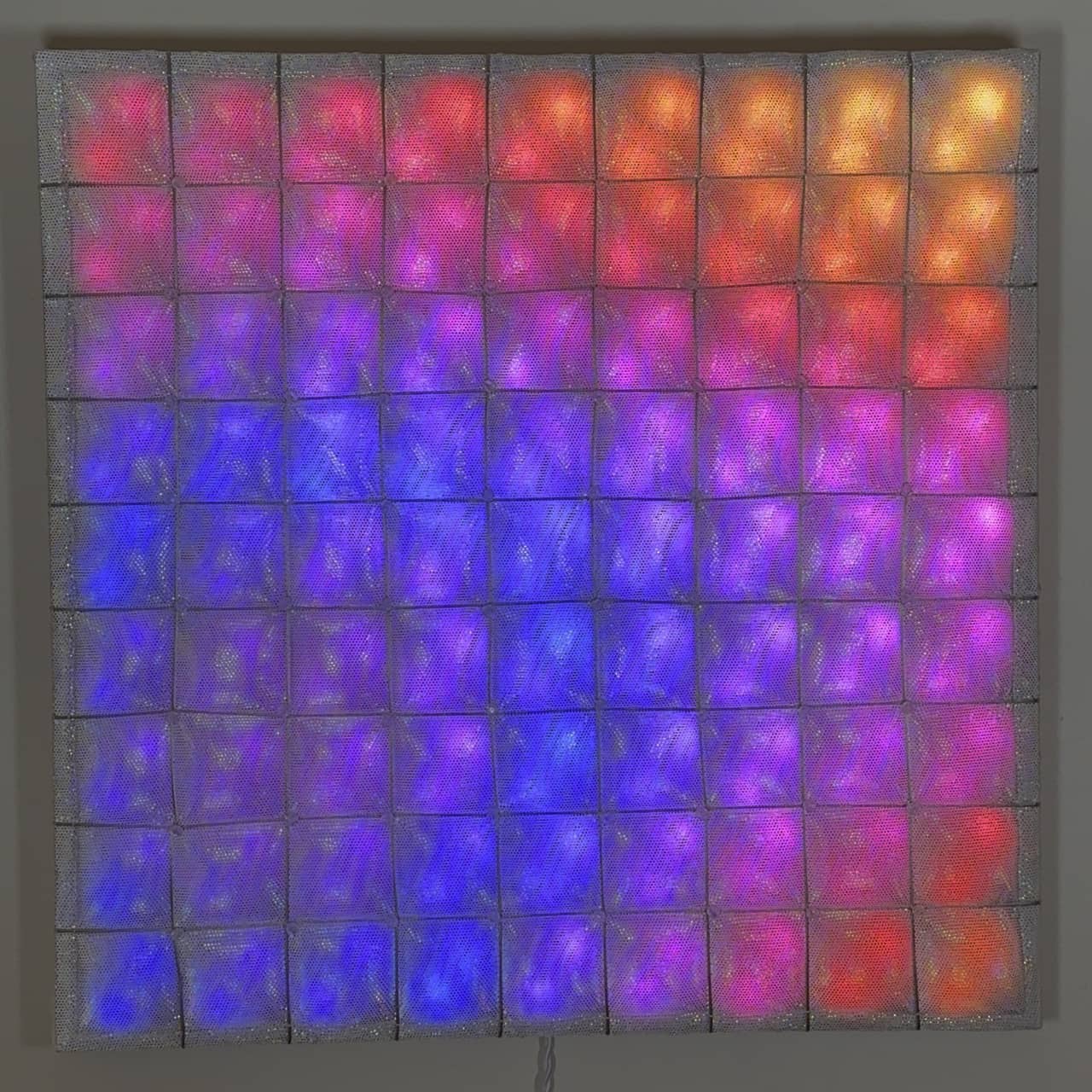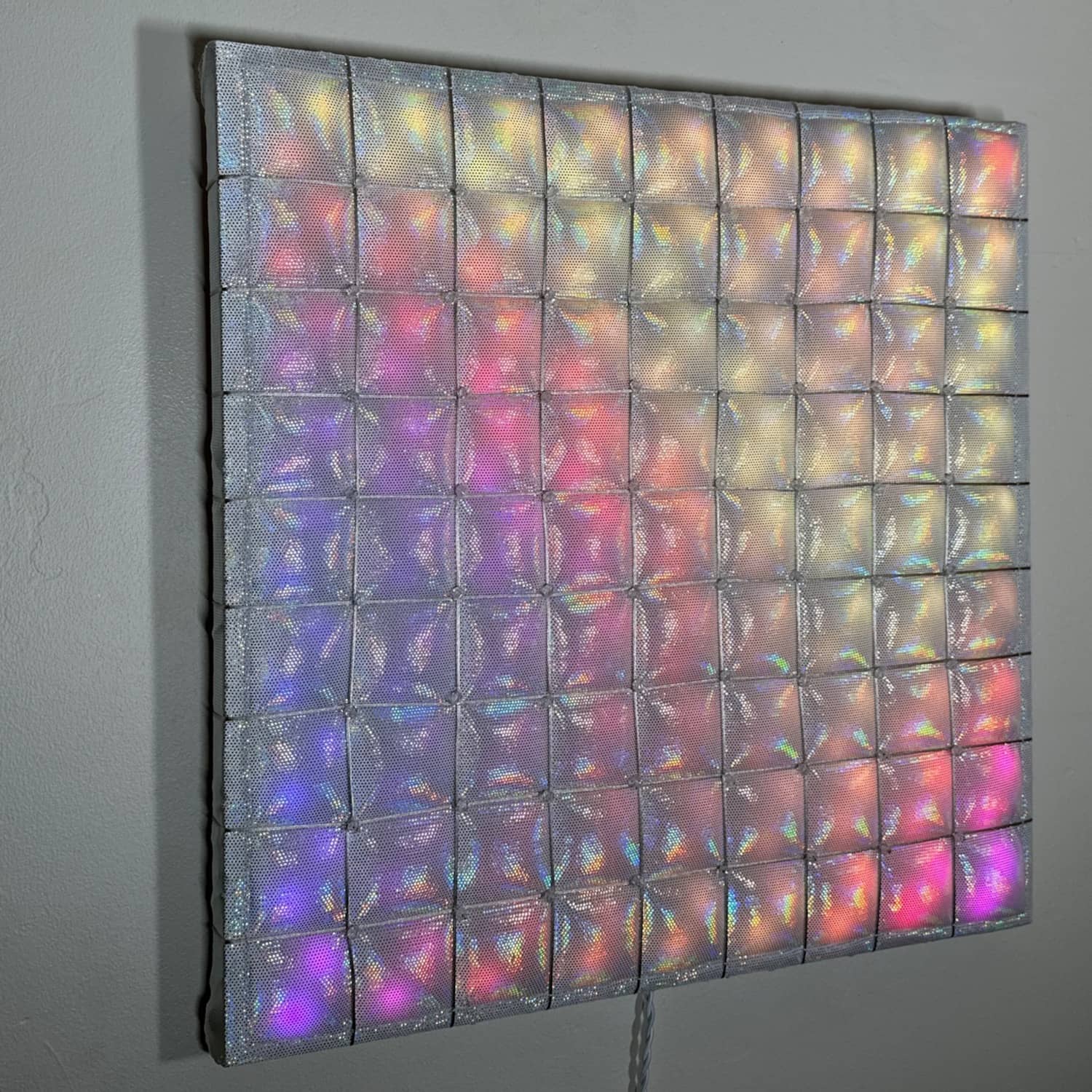 This work uses RGB LED pixels to create vibrant animated light patterns behind a fabric panel with a grid of squares. Light shines through a white velvet fabric with small holographic polka dots that block some of the internal lighting while also reflecting some external lighting (if present). A layer of polyester behind the fabric adds thickness while also diffusing the internal lighting.