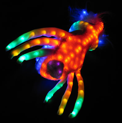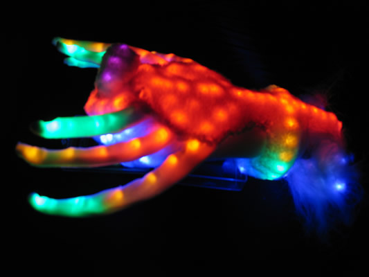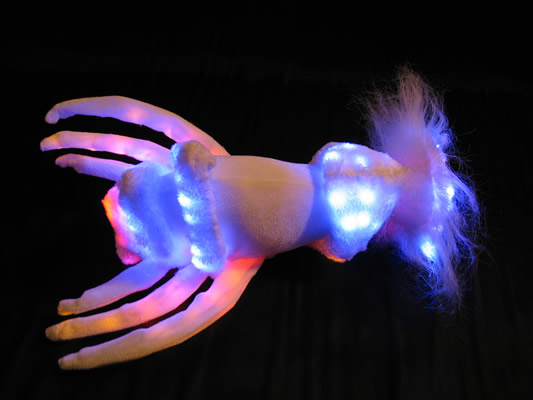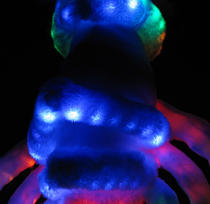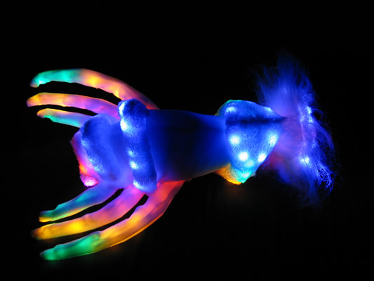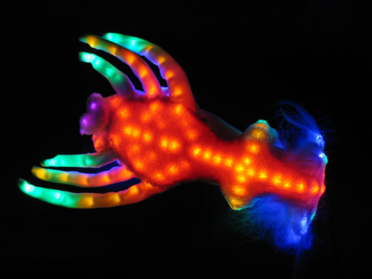 Imagine a found object, of alien origin. Its shape resembles a creature, but it is also soft, cuddly, and blinking in a variety of complicated patterns. Is it a child's plush toy, from another galaxy? Or is it a live being? Or both?