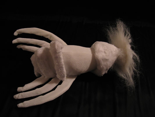 White velvet and faux fur soft sculpture, with internal plastic armature and polyfill stuffing