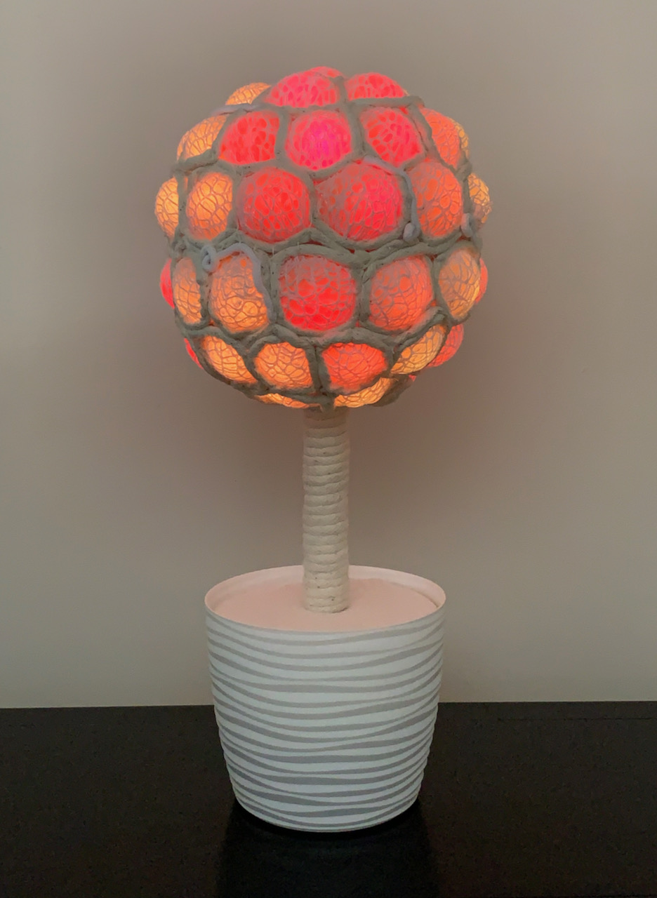It is intended to mimic a potted plant or small tree, with a vertical trunk topped by a sphere, which is then covered by smaller foam hemispheres. The outer surface is covered with a few types of mesh materials, and the boundaries are filled in with a few types of rope, following a somewhat irregular pattern to suggest that it is a growing organic material.