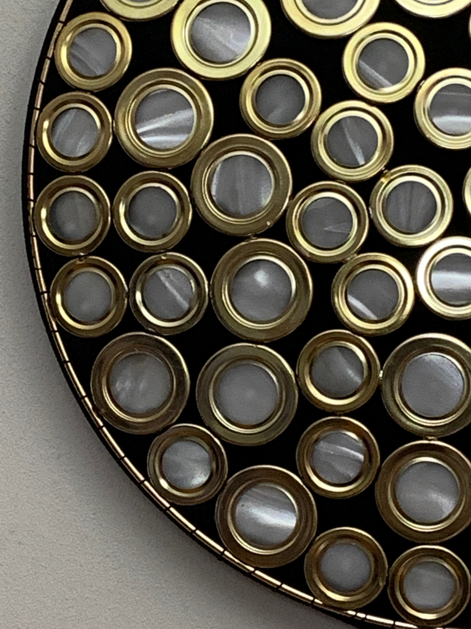 This piece is made of soldered metal brass-colored rings arranged to fill a circle. The rings are arranged in a semi-regular packing pattern, with black neoprene filling in the gaps between them. Each ring is fitted with a lenticular vinyl lens which distorts and diffuses the light from the RGB LED pixel mounted behind it.
