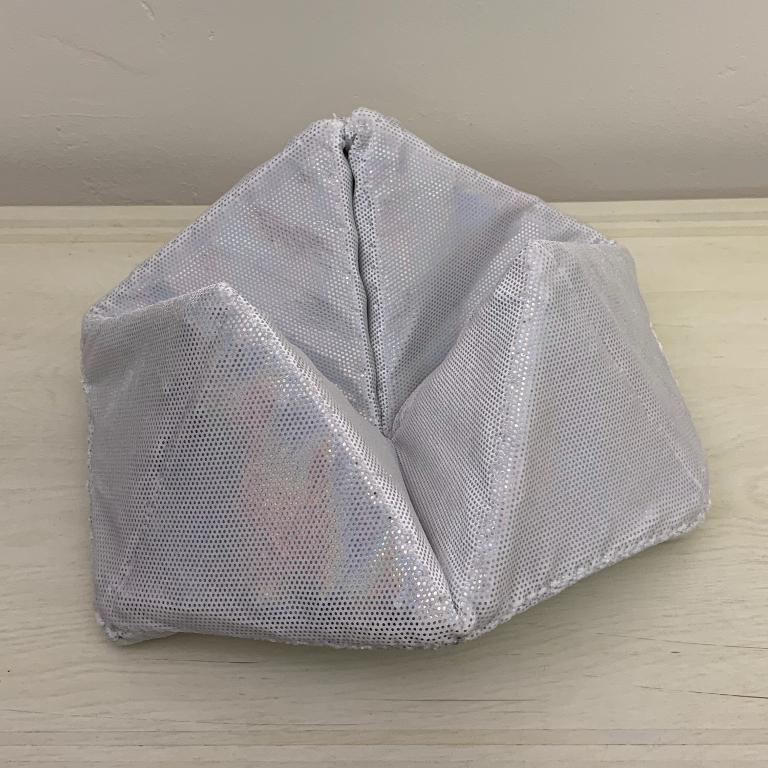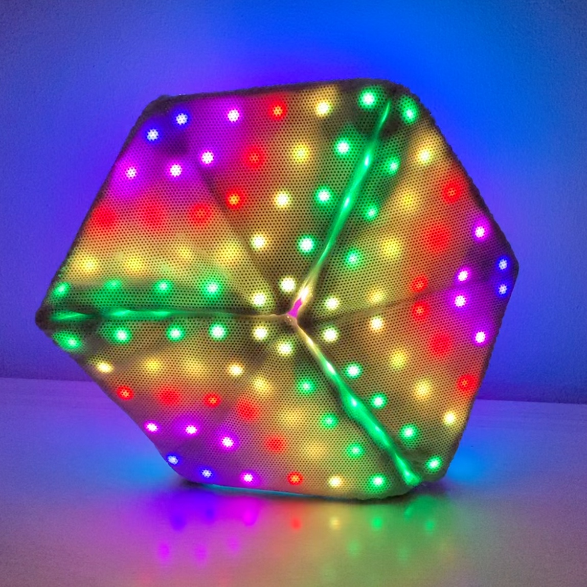 The piece contains repeating triangular segments that are illuminated in a variety of twinkling patterns and effects, including some that activate the LEDs individually, and others that highlight the geometric symmetry. Many of the animation patterns are also sound reactive.
